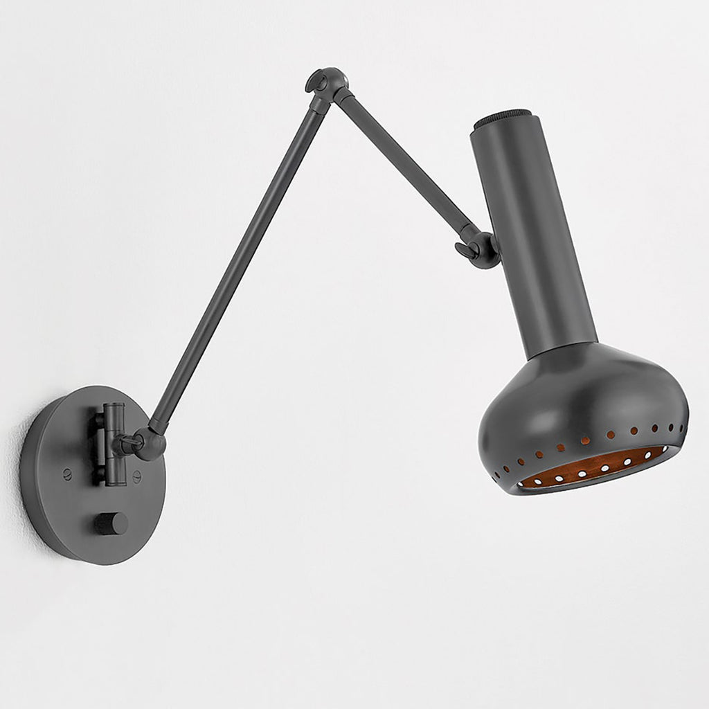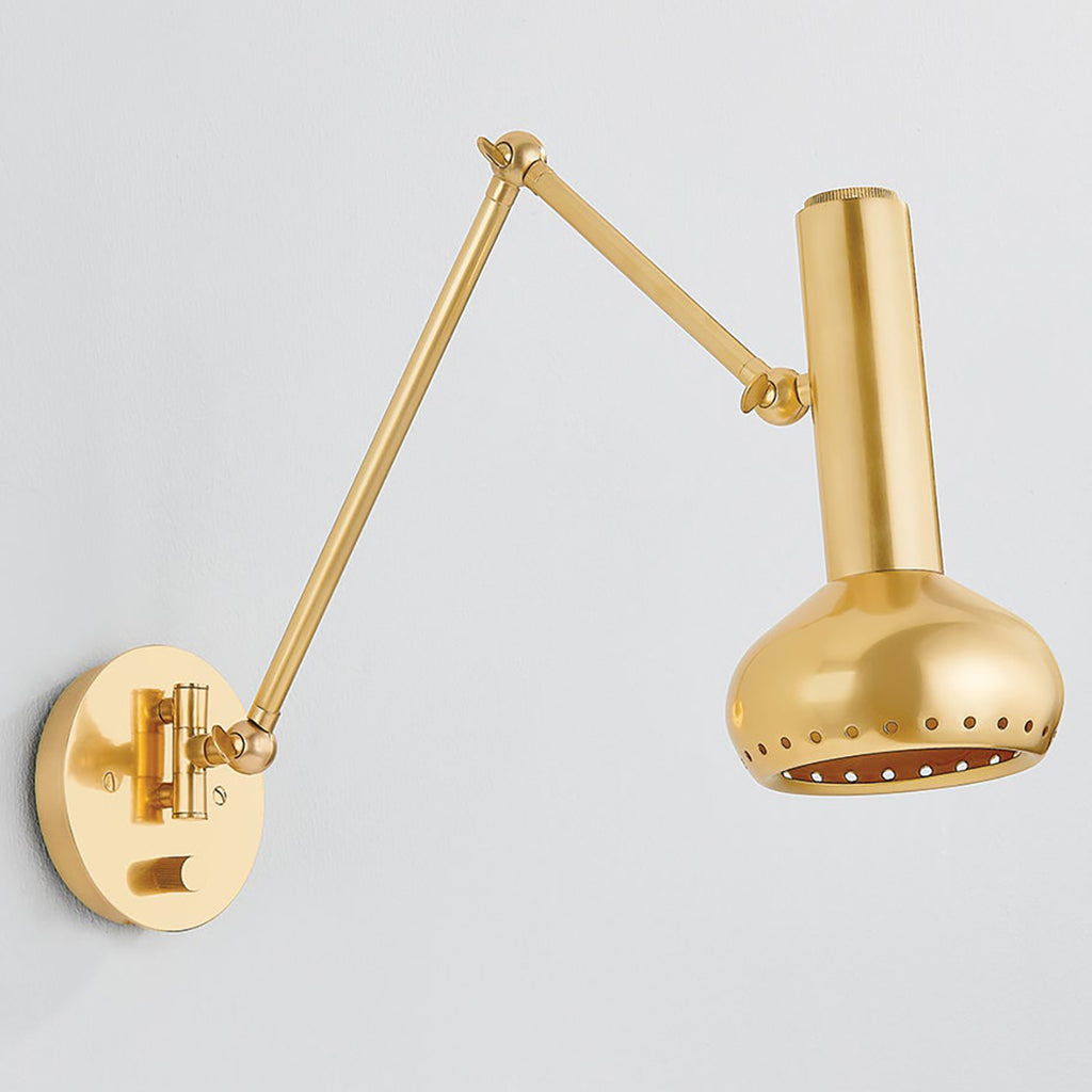 The atomic curves, metal detailing, and slender, adjustable arm of Hudson Valley Lighting Roald nod to its mid-century inspiration. Ideal as a reading light in a bedroom or office, this versatile sconce features a gourd-shaped shade with decorative perforations. Choose from an Aged Brass or Distressed Bronze finish to complement your decor.