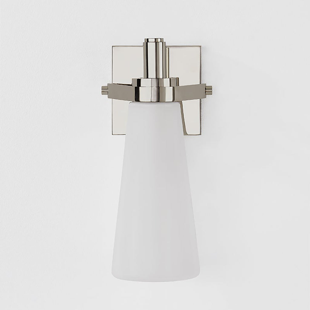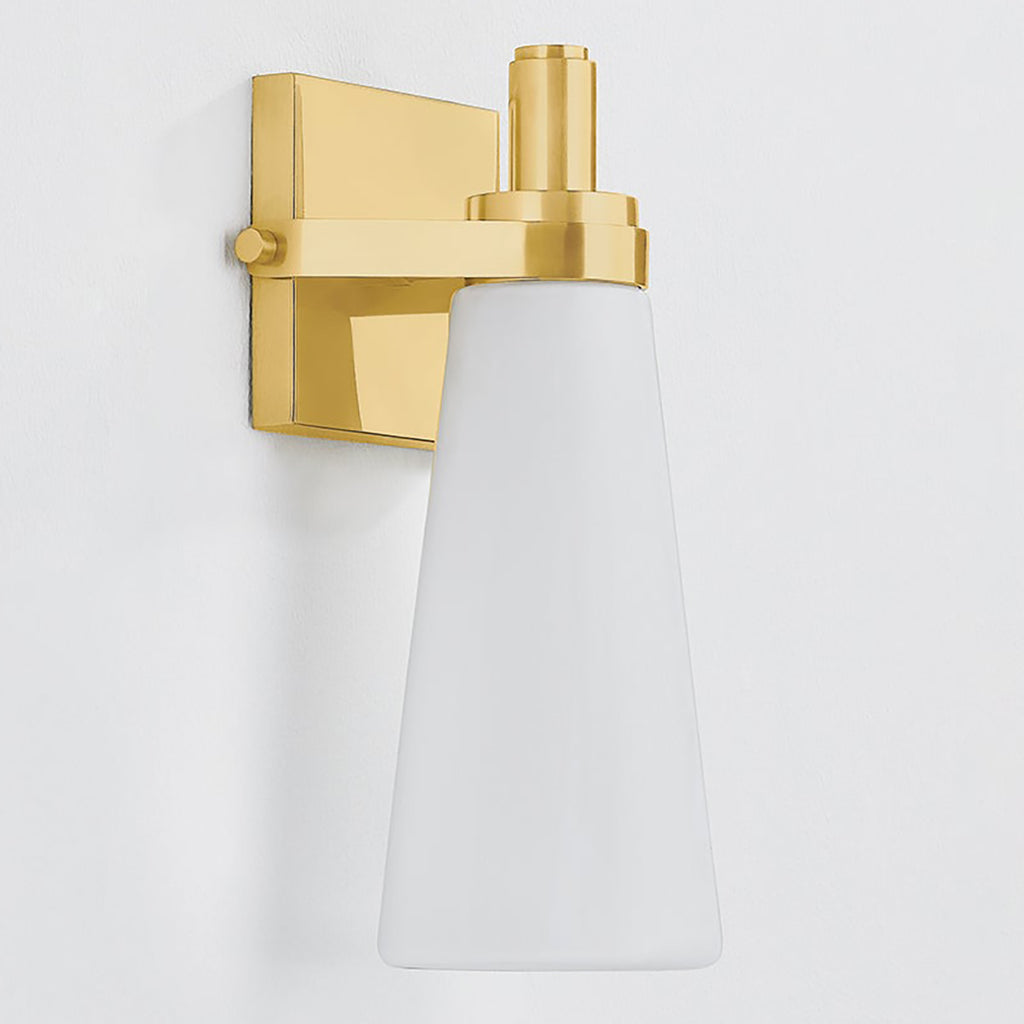 Form meets function in this simple yet refined sconce. The conical opal glossy glass shade of Hudson Valley Lighting Trude tapers into a wider opening at the bottom, creating a powerful downlight. Rather than a traditional arm back, the upscale mechanical metalwork nods to mid-century modern design aesthetics. The frame is available in Aged Brass or Polished Nickel for a more classic or contemporary finish.