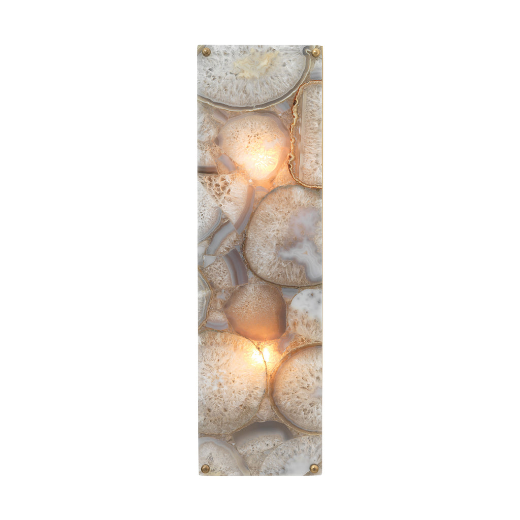 A collage of natural agate stone is joined together with clear resin and antique brass. The Jamie Young Adeline rectangle wall sconce's natural sculpture creates different colors and patterns within each piece, making it a truly one-of-a-kind piece in your home and on your wall.