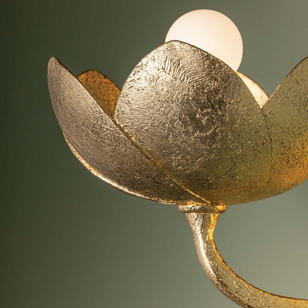 A fresh take on a botanic motif, the Troy Lighting Arcata family features sculptural, romantic silhouettes with highly tactile, hand-worked finishes. The gentle sweeping arms transition from square to round, creating a dynamic look that complements the floral forms. Arcata is available as a 1-light sconce and 6 or 8-light chandeliers with the choice between contemporary Gesso White or a luxurious Vintage Gold Leaf finish.