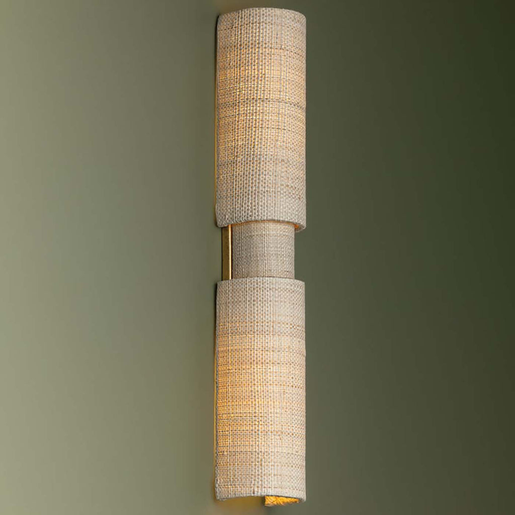 The beauty of the Ashton sconce stems from its simplified form and distinctive materiality. Woven from Saguran fabric, three cylindrical shades overlap to form areas that emit more or less light. This highly textural 2-light sconce is perfect for a bathroom or other small space as it creates a serene ambience.