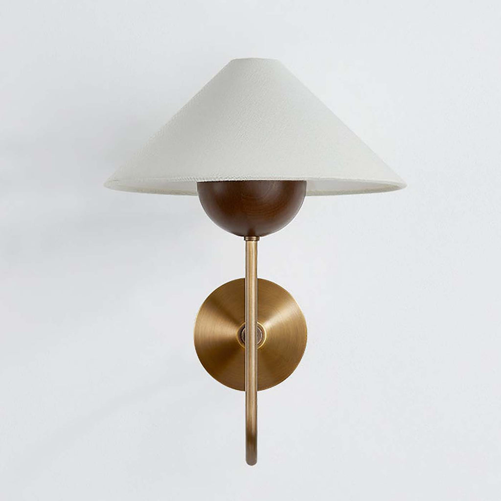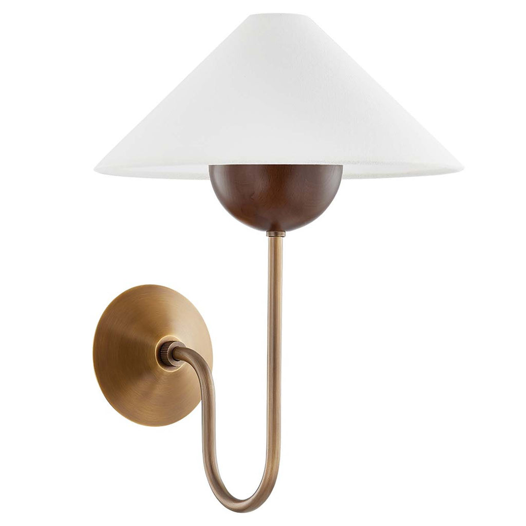 Combining geometric shapes and three distinctive earthy materials, the Troy Lighting Evan sconce generates its own visual design language. The design-forward composition includes a swooping J-arm in Patina Brass, leading into an overscale walnut wood bobeche. As a note of contrast, the fixture is topped by a sharply tapered shade made from grained white linen.