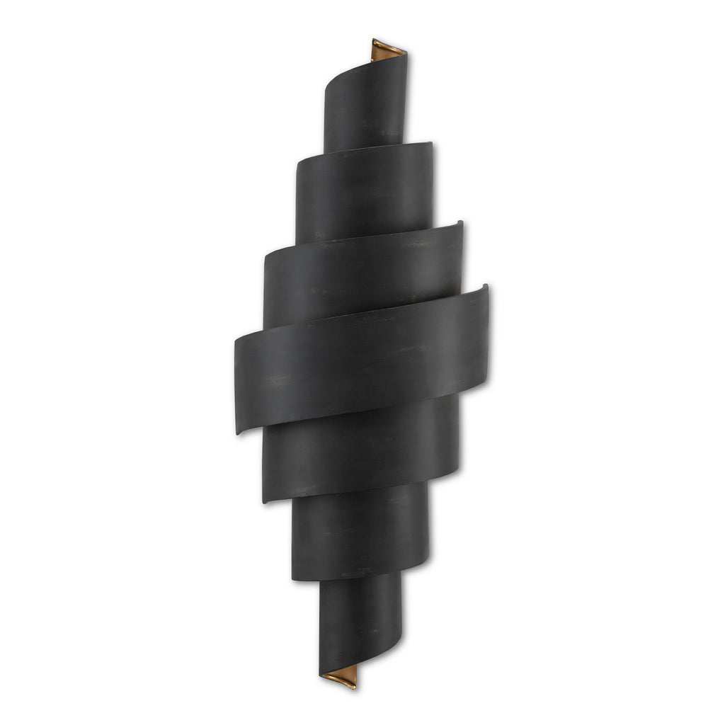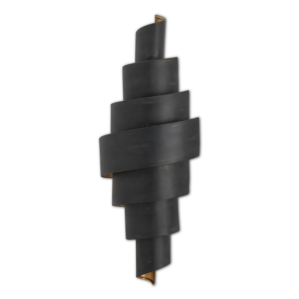 Any way you slice it, the Currey & Co Chiffonade Wall Sconce has an elegant fluidity in its lines that curl toward the wall and end at the top and bottom with a lovely swirl. Made of wrought iron, the exterior of this sconce has been treated to a French black finish. To heighten the gracefulness of the piece, the interior has been treated to a painted gold finish. This also brings a warm glow to the illumination that wafts from between the arcing bands of metal.