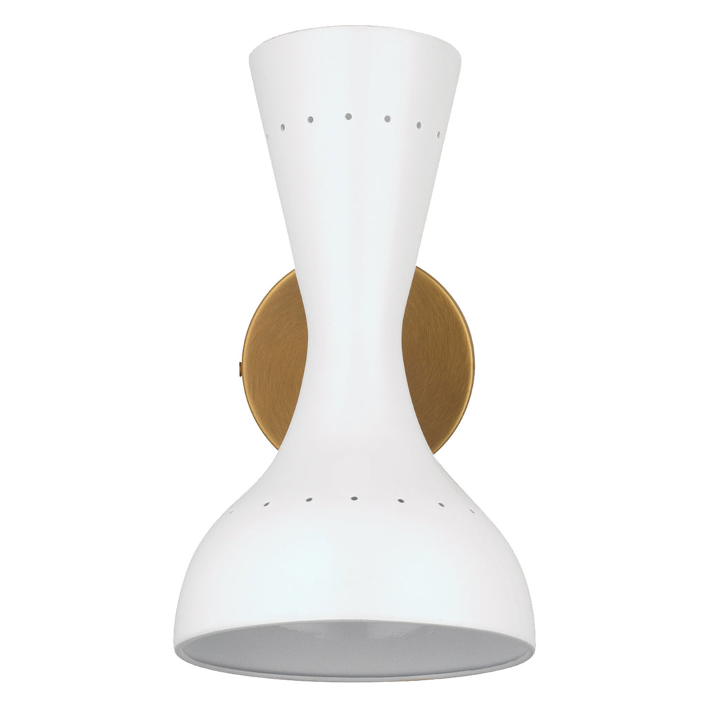 A mid century inspired task wall sconce with an hourglass hood with two directional sockets. One upward socket and one downward within the swivel hood make it easy to direct light for a great working environment. The antique brass or white high lacquer silhouette creates a classic mid century modern look.