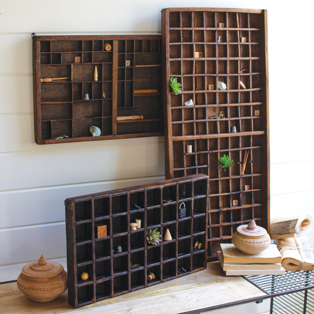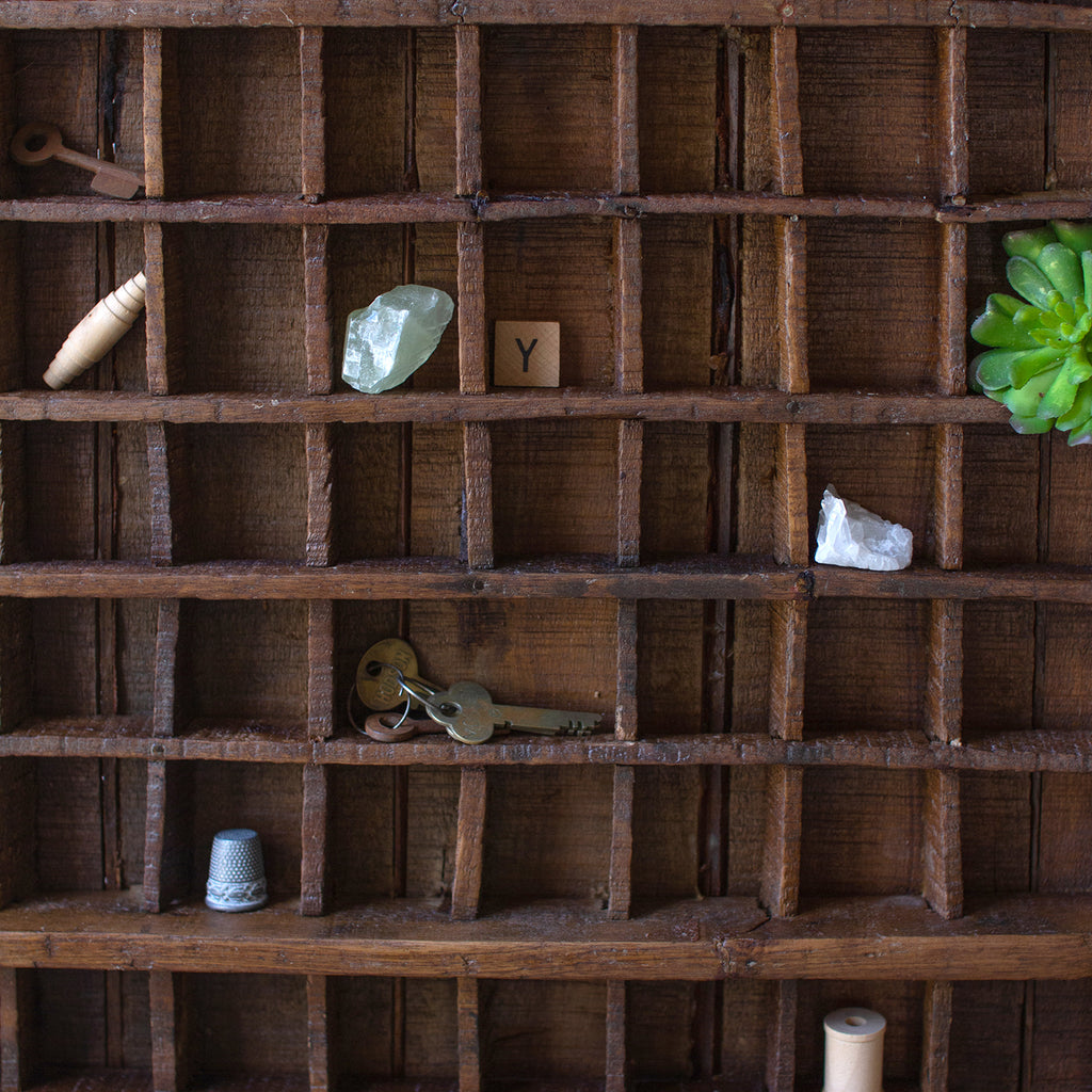 This wooden printers tray is a true antique with a fascinating story to tell. It's up to you to choose how it's told. With its plethora of little compartments, varying in shape and size, this vintage treasure allows you to curate your own piece of wall art. Display your miniature collectibles and keepsakes with quirky charm.