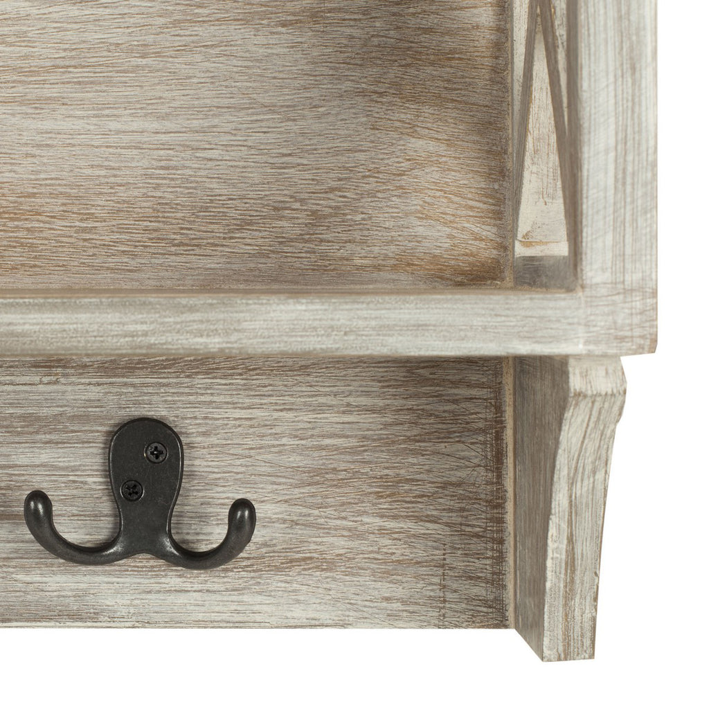Organize any space in an instant with this traditional hanging storage wall rack. Its grey finish and classic design give a warm feel to any entryway, kitchen or mudroom, while its open storage compartments and three double hooks allow easy access.