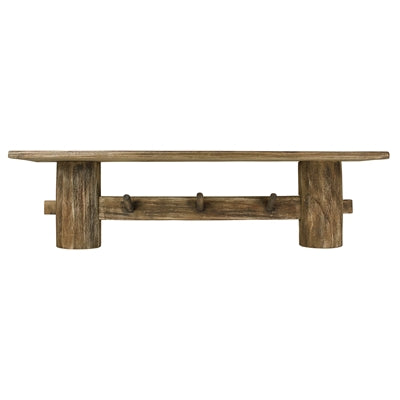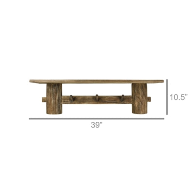 A sturdy and sizeable wood shelf featuring 3 pegs for hanging coats and bags and a wide surface to drop a hat, keys and glasses.