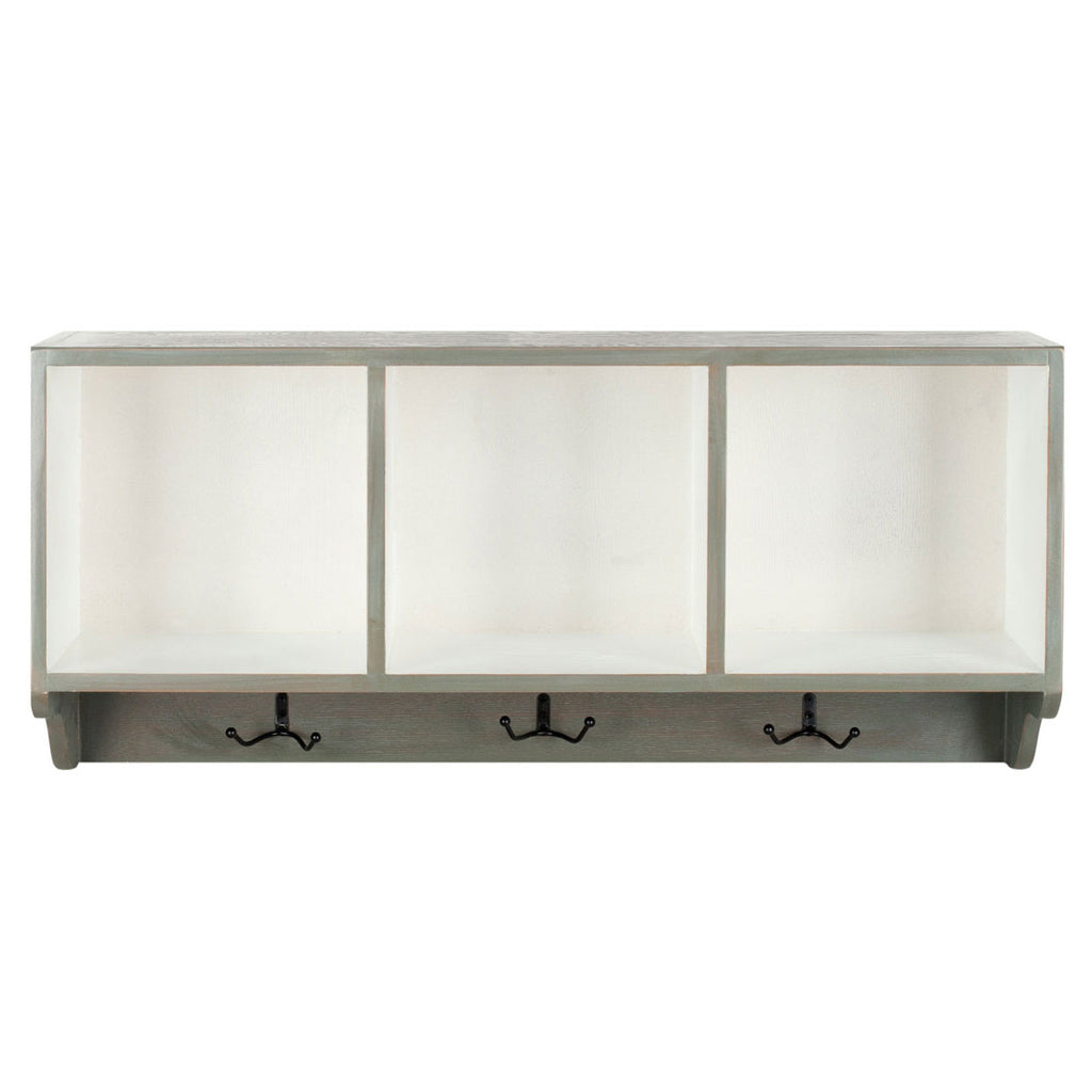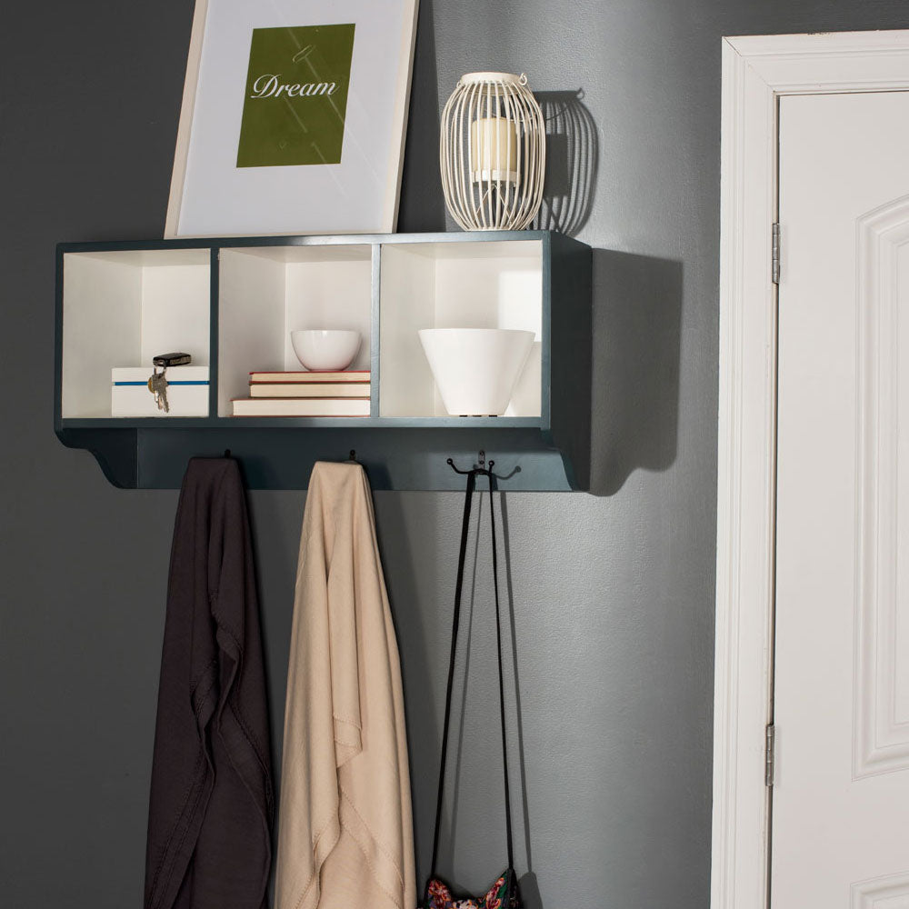 Reminiscent of schoolhouse cubbies, this two-toned wall shelf is designed to minimize entry hall clutter and keep kids organized. Finished in bright red or ash grey with contrasting white interior storage spaces, this charming piece also has hooks for coats and scarves. With its clean casual lines, this cubby wall shelf complements transitional and traditional interiors.
