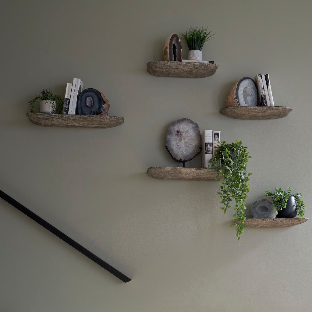 The Stone Floating Wall Shelf is an organic take on your average floating shelf. The subtlety of the Gray Stone finish makes it a great addition to any room, and its rounded live-edge design adds a touch of sophistication to any space. Whether looking for a new way to display your favorite books or searching for a stylish and modern shelving solution, the Gray Stone floating shelf is a perfect choice.