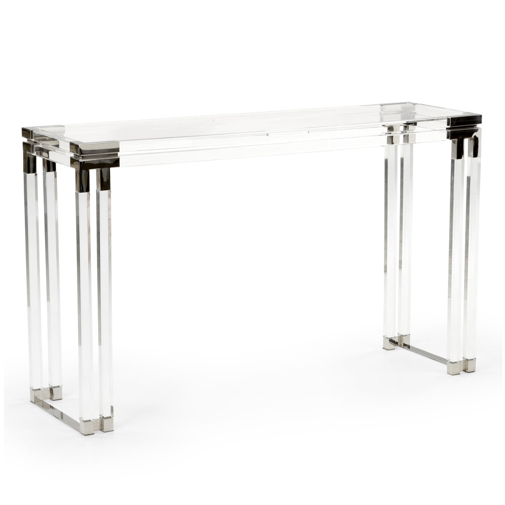 Bring Wildwood's signature style into your room with this beautifully textured console table. Simple and chic, this furnishing complements both modern and classic vibes. Modern acrylic console with polished nickel accents.