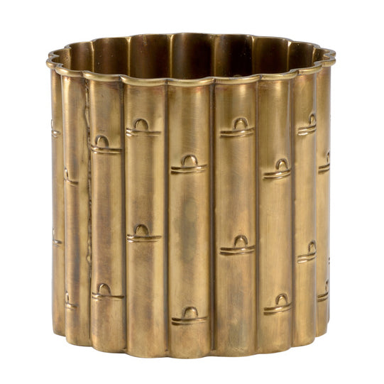 Enhance your everyday décor with this elegant piece from Wildwood. Timeless and chic, this décor fuses timeless texture with a gorgeous finish to capture attention.  The Wildwood Brass Bamboo round planter in Antique Brass with bamboo design on sides and scalloped top edge.