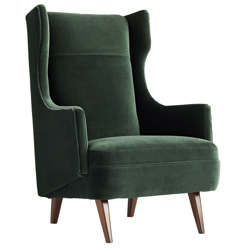 A wingman for evenings at home—plush forest velvet cushioning and sculpted modern lines create a favorite chair that blends comfort with striking style—finishes will vary.