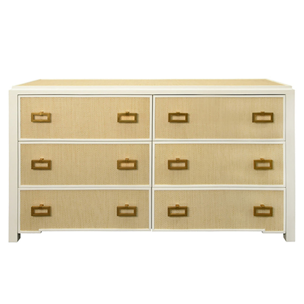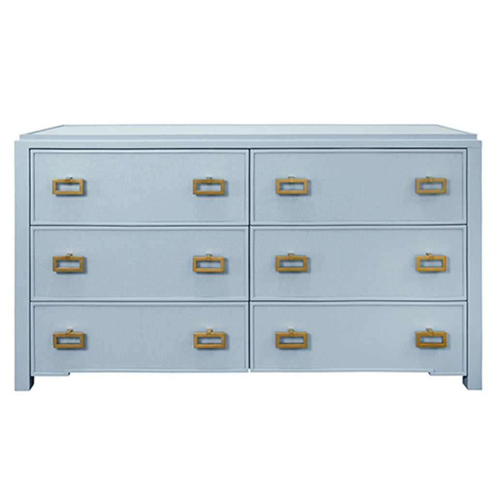 • Six drawer chest with matte light blue frame and light blue grasscloth drawer fronts or matte white lacquer frame and natural grasscloth drawer fronts