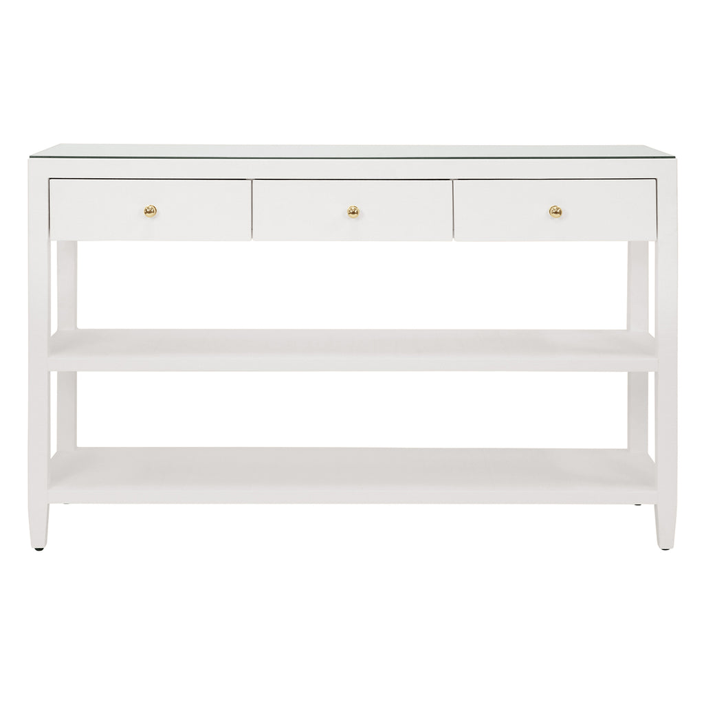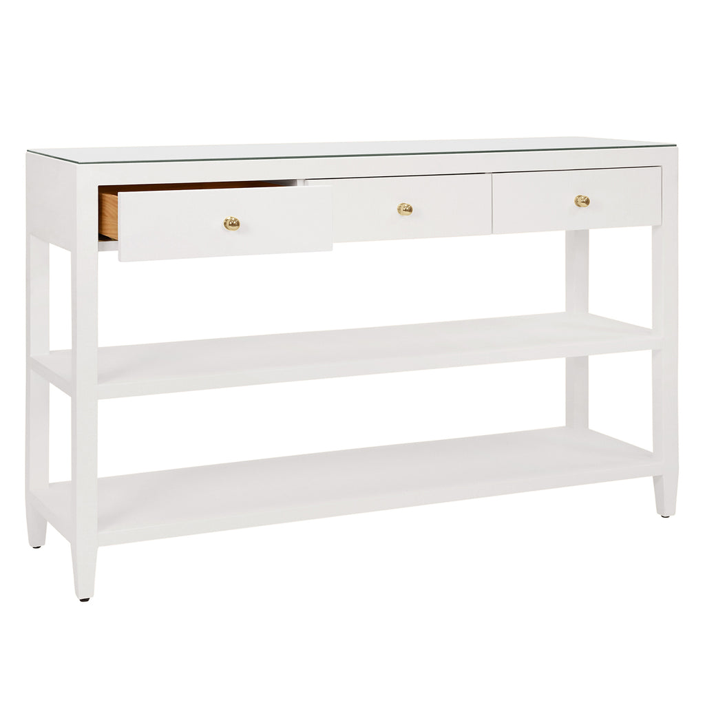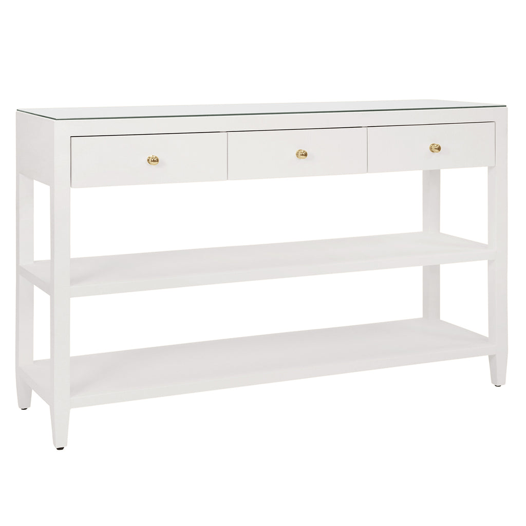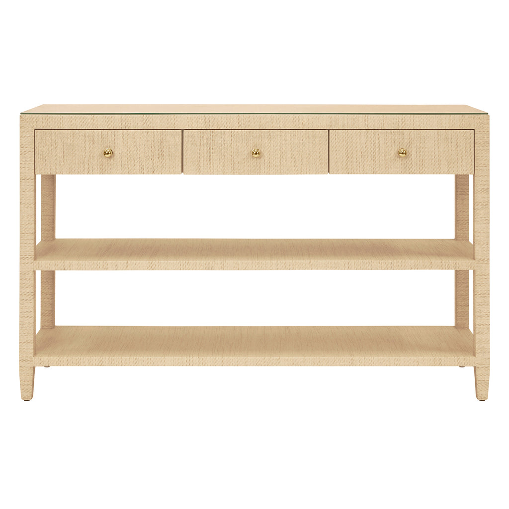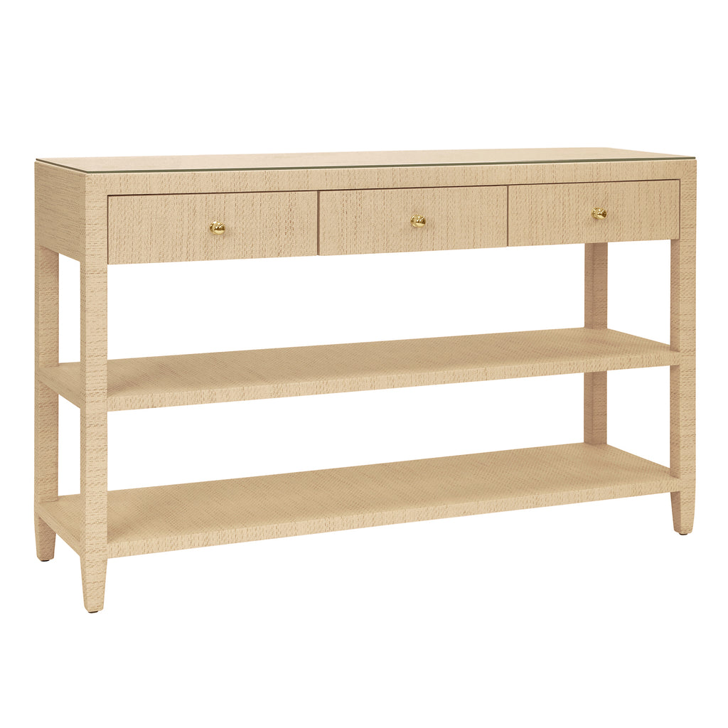 Three drawer console with two open shelves in textured linen with polished brass knobs and glass top.