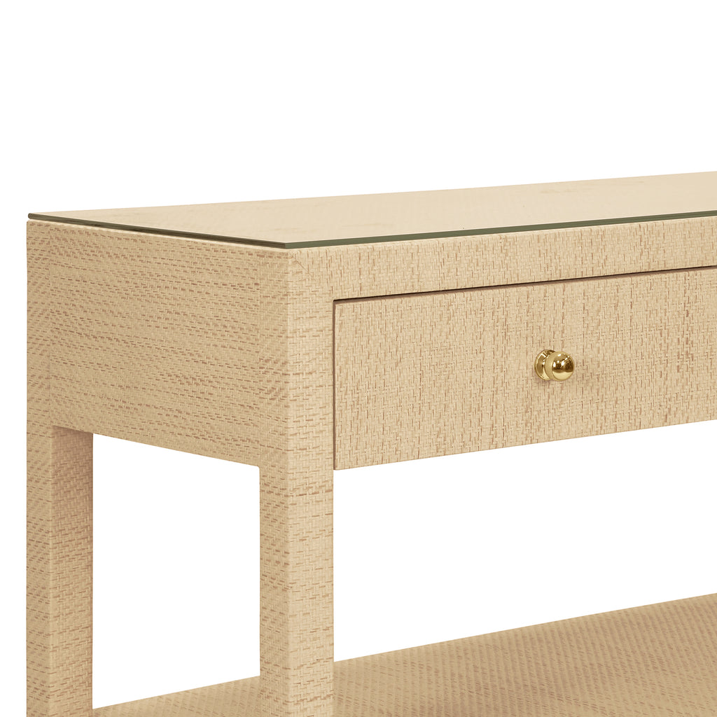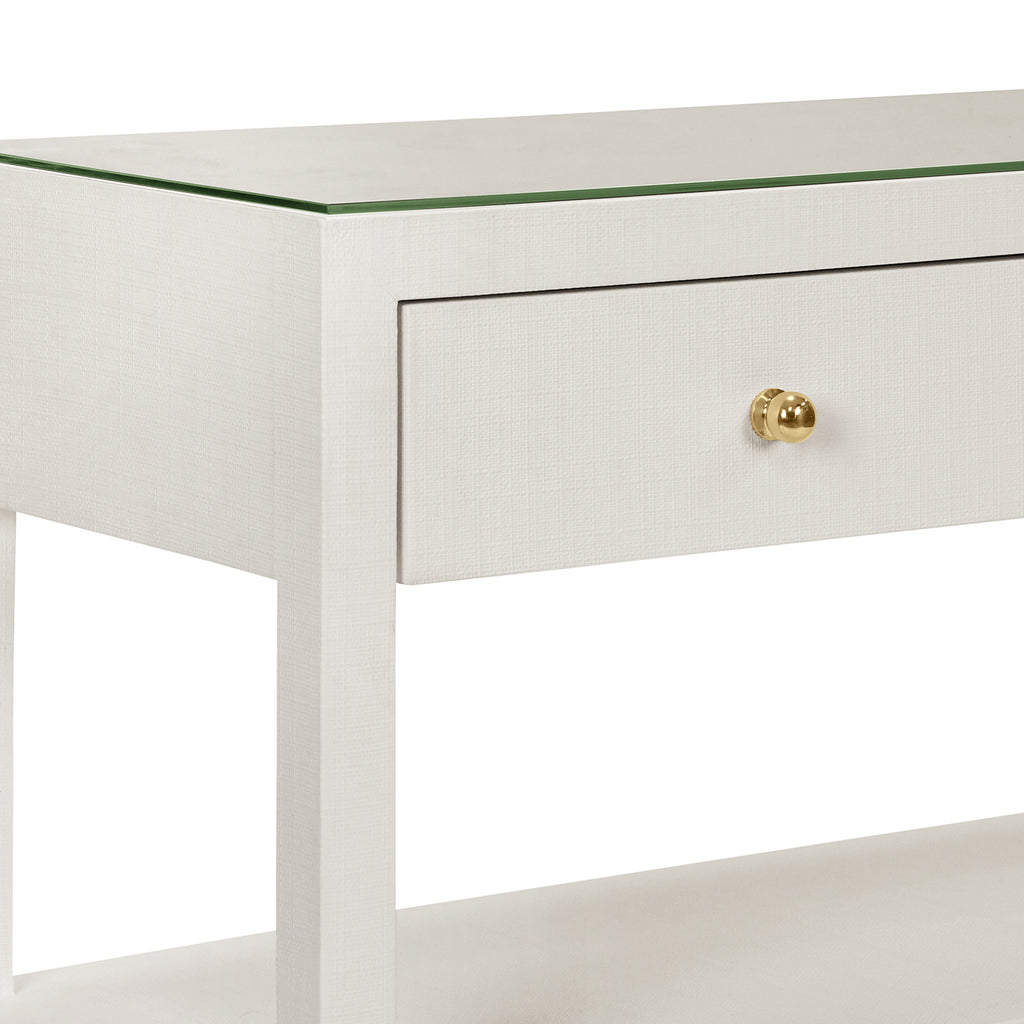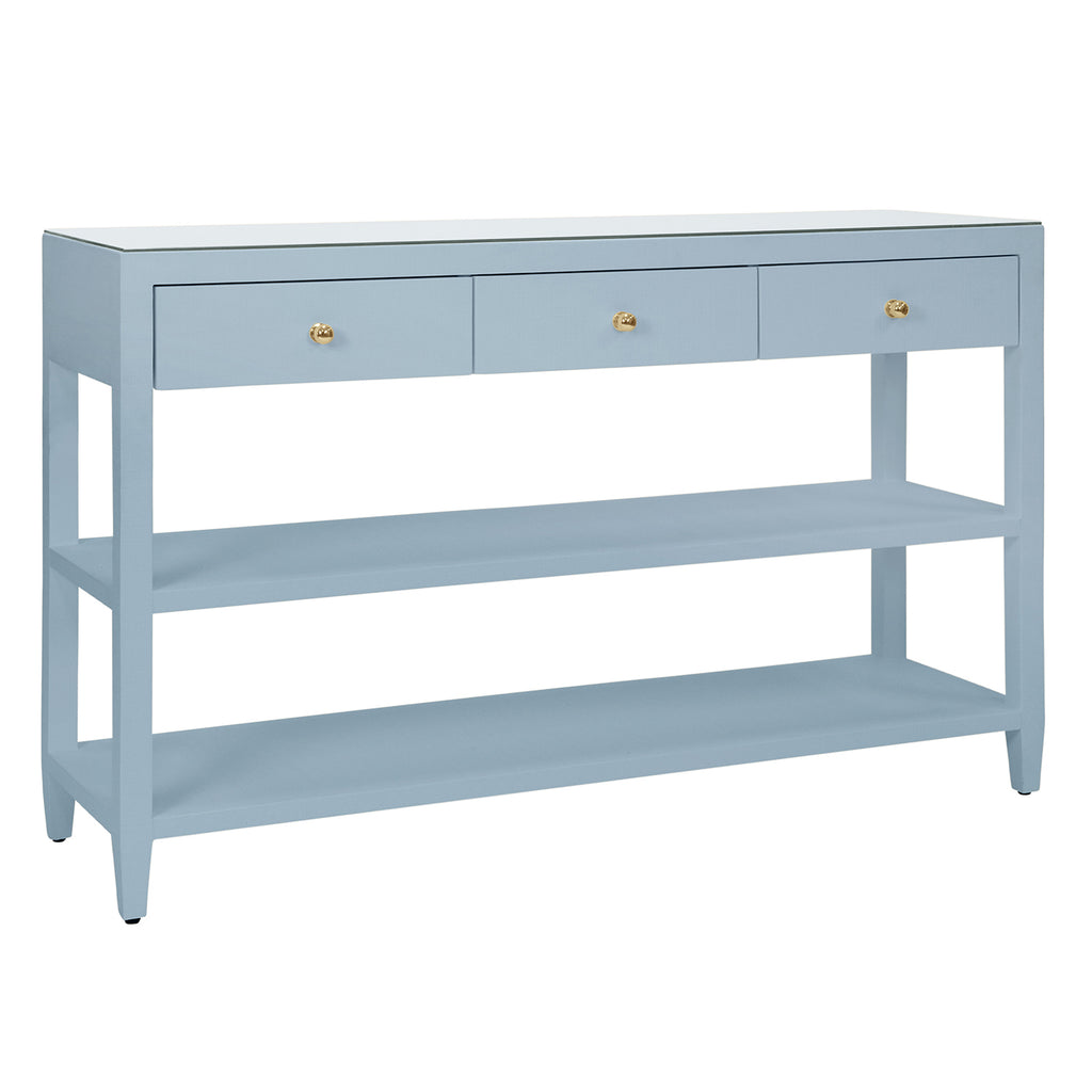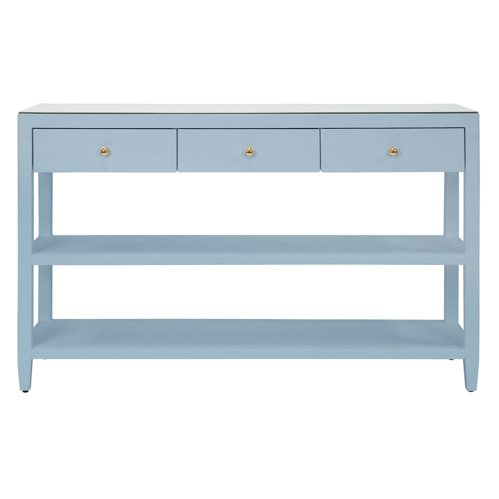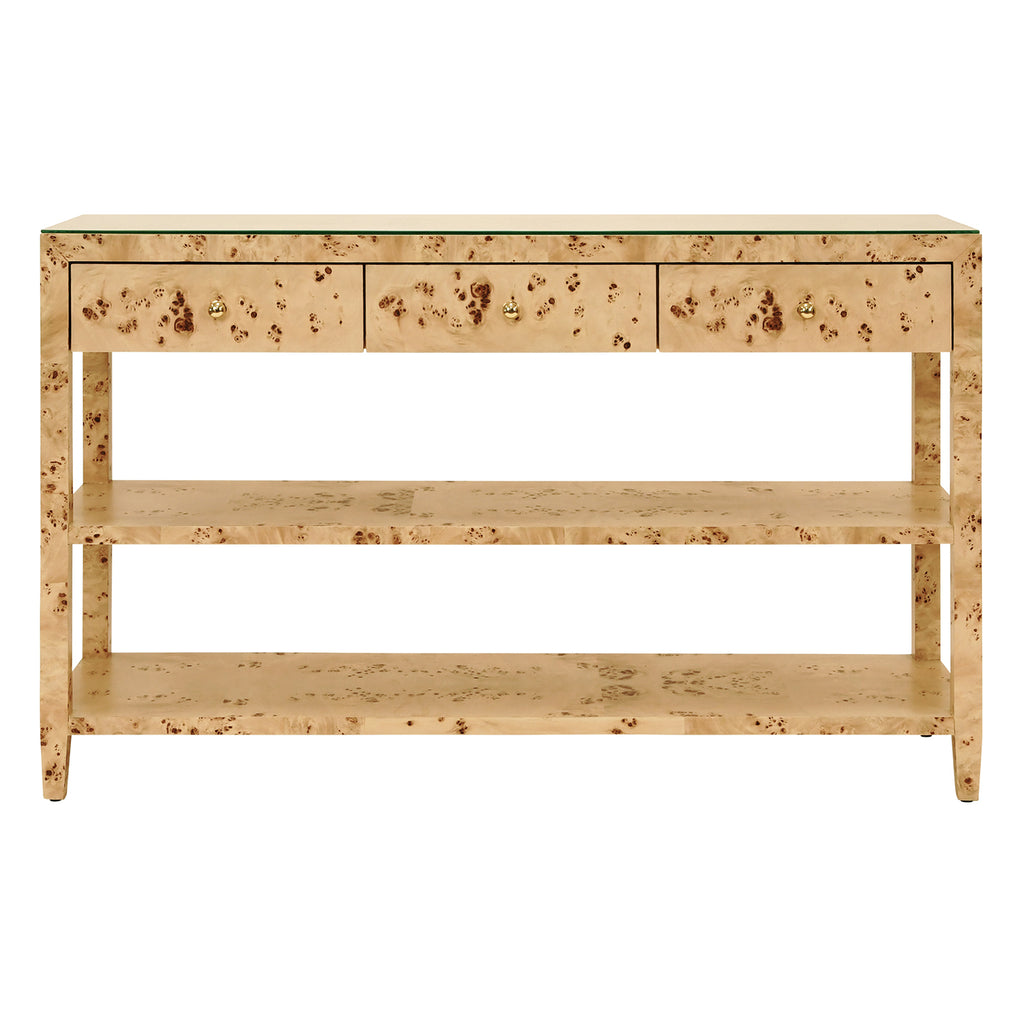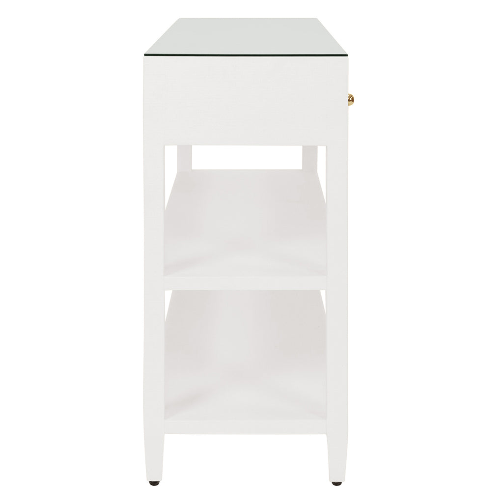 Three drawer console with two open shelves in textured linen with polished brass knobs and glass top.