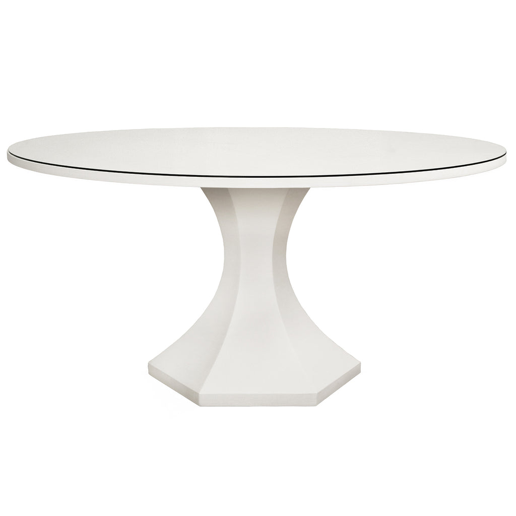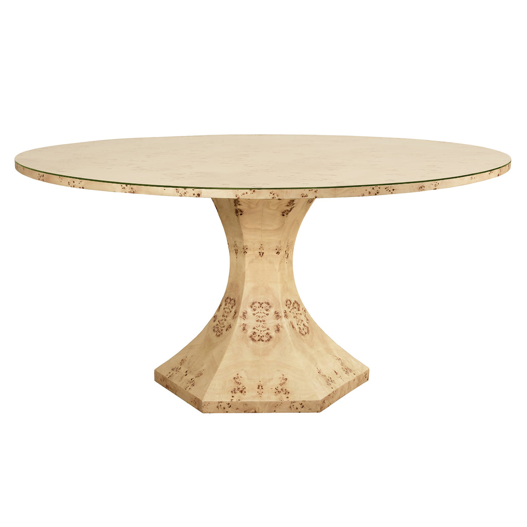 Round dining table with hexagonal tapered base and glass top in matte burl wood