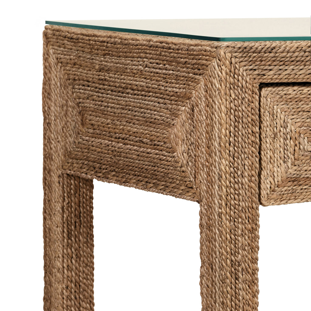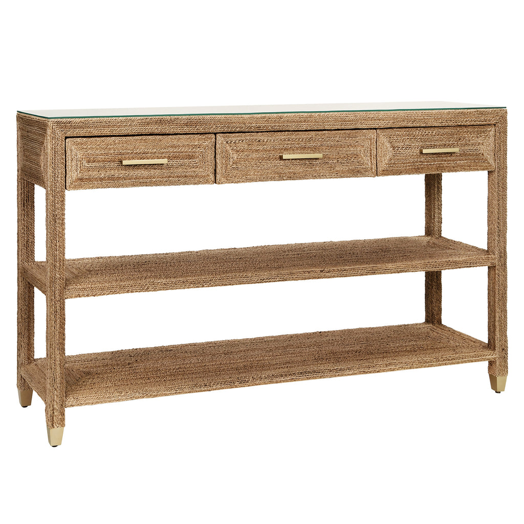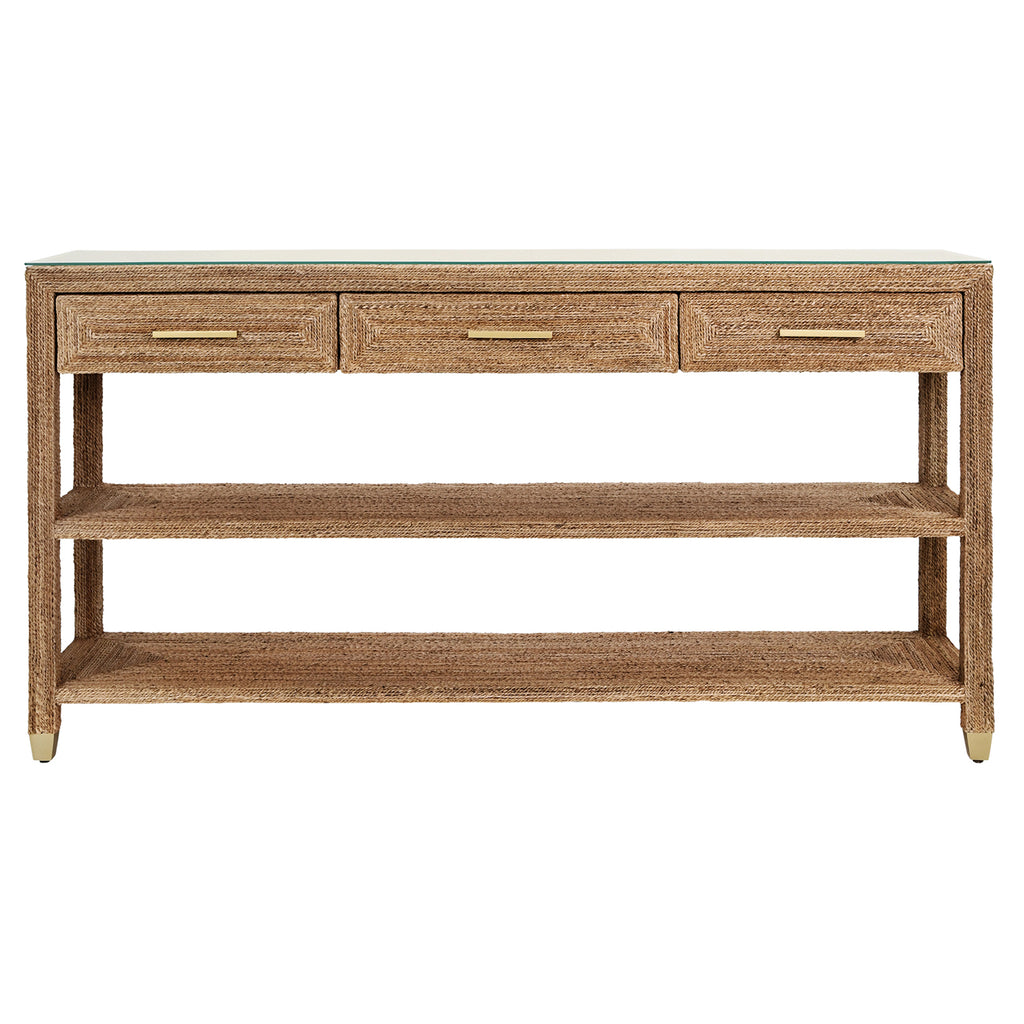 Three drawer console with satin brass hardware, glass top, and foot caps in wrapped rope
