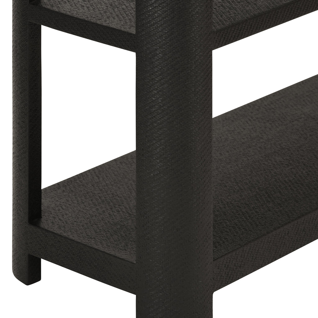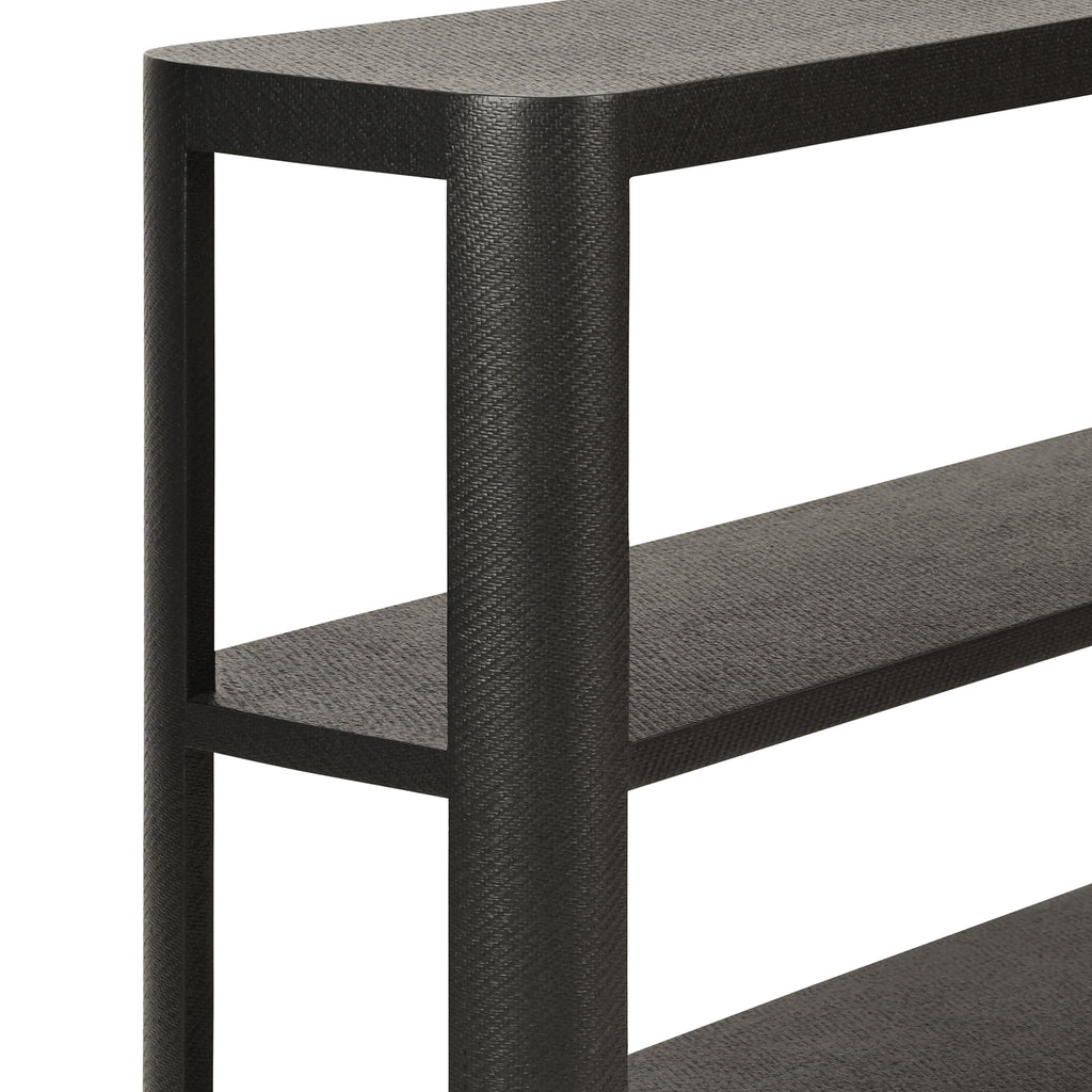 The Emery three tier console is a masterclass in understated opulence. Sleek, softly curved corners meet the rich depth of black painted grasscloth which creates a visual harmony that feels both grounded and fluid. Each tier floats effortlessly, offering a perfect balance of sculptural form and function. Designed to command attention yet whisper refinement, the Emery elevates any space with its seamless blend of modern sophistication and timeless allure.