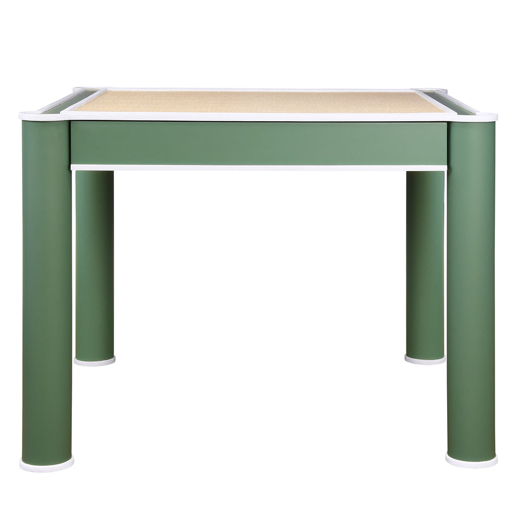 Square two drawer round leg game table in matte green lacquer with matte white lacquer edging