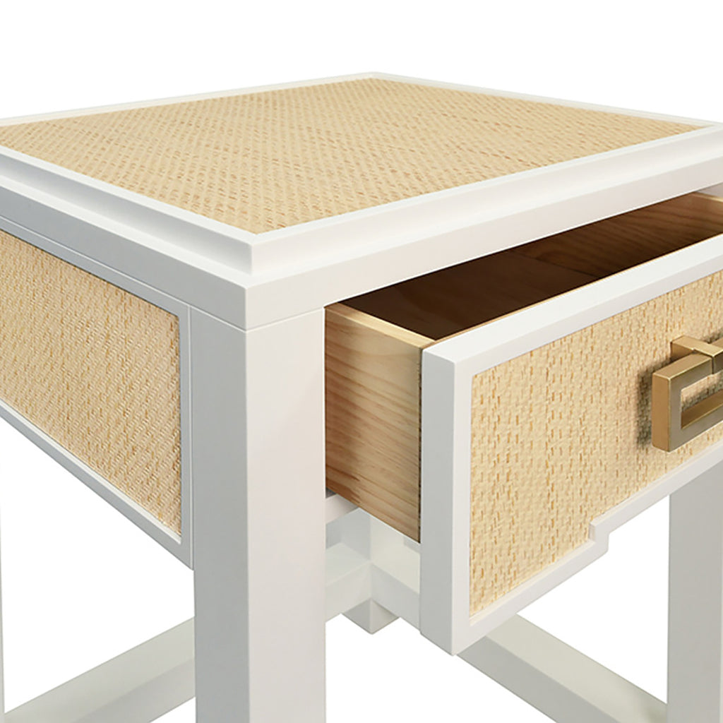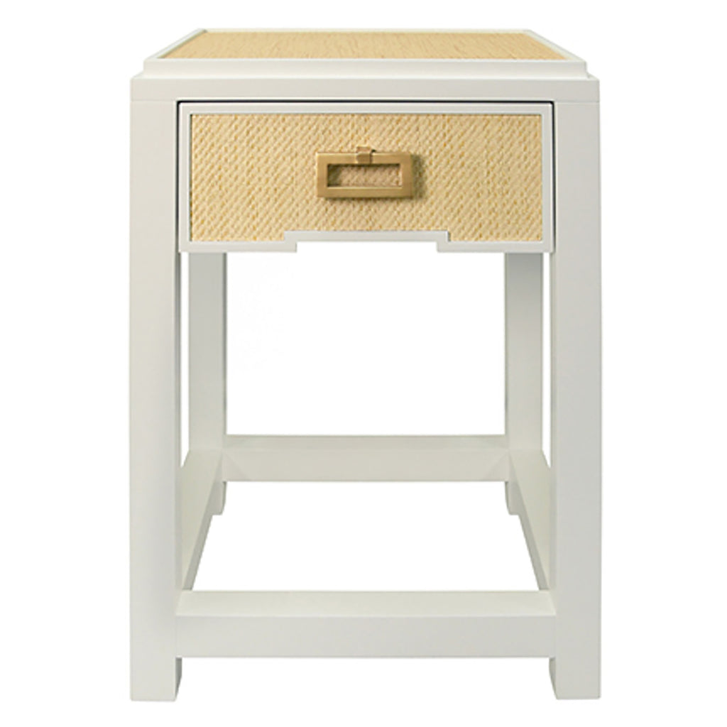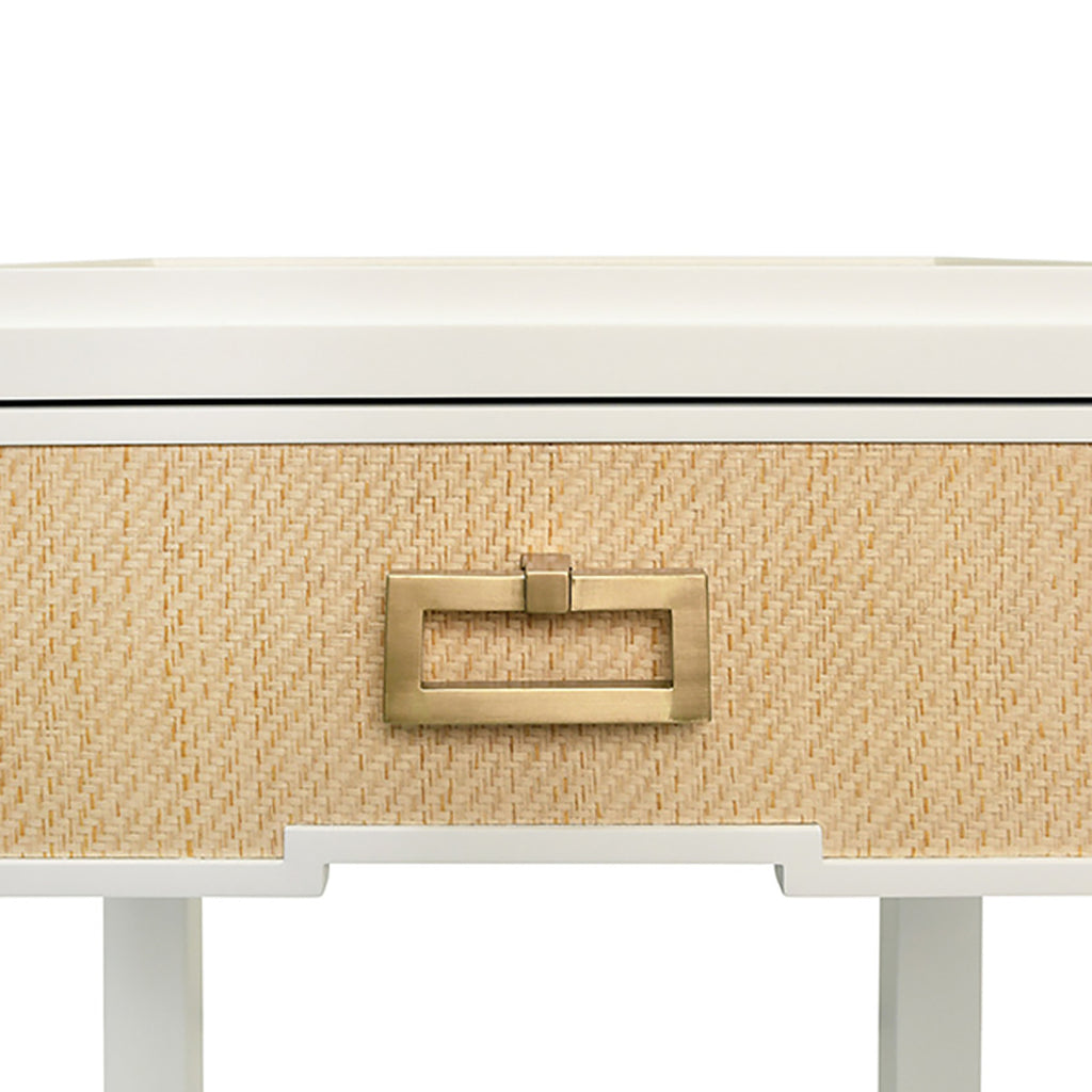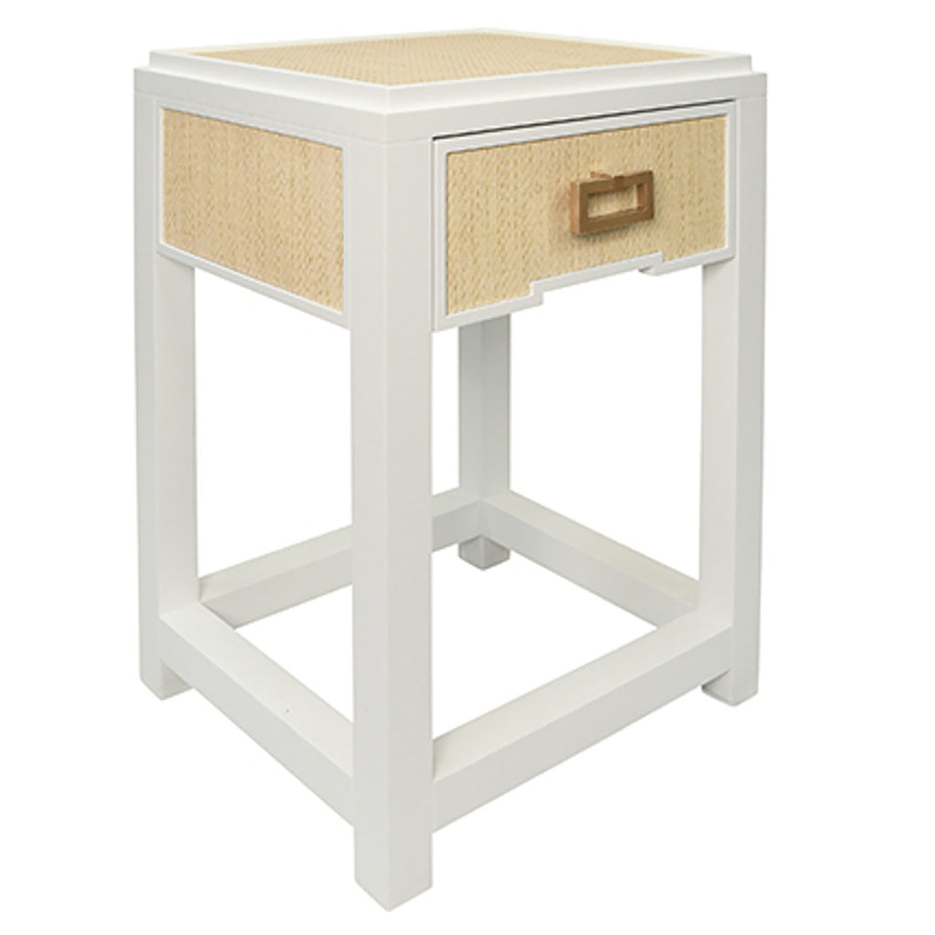 • 1 Drawer side table with matte light blue frame and light blue grasscloth drawer fronts or matte white lacquer frame and natural grasscloth drawer fronts
