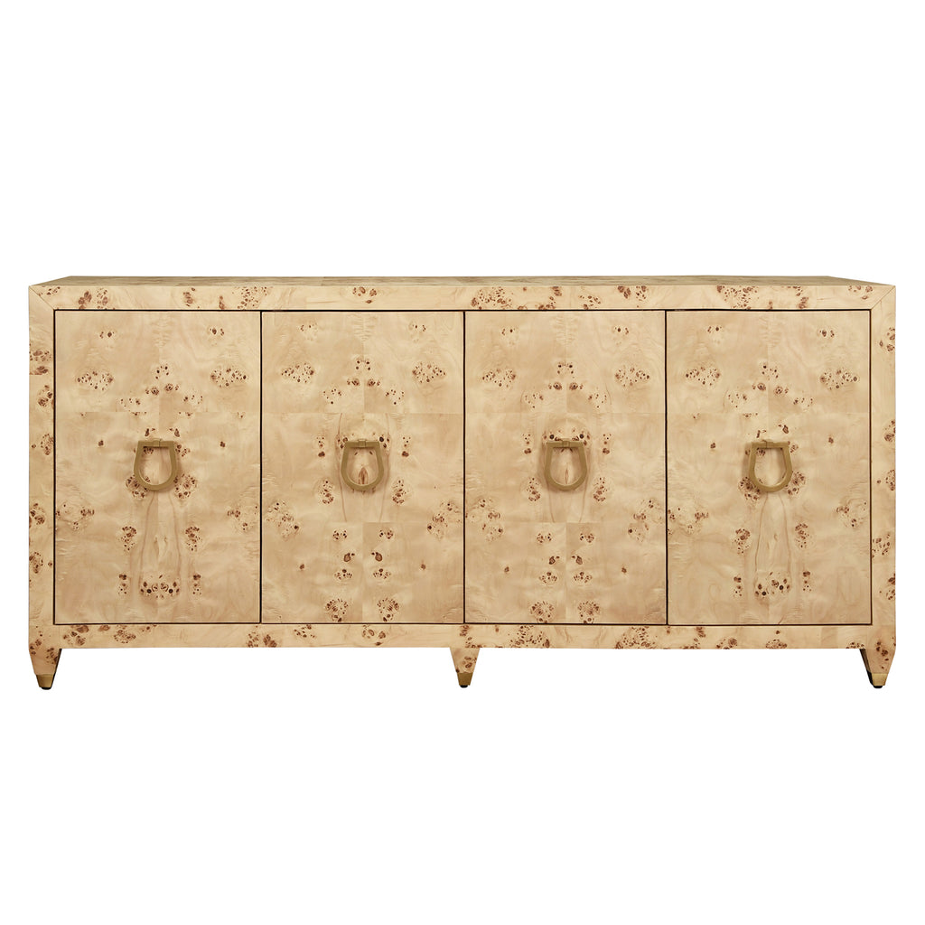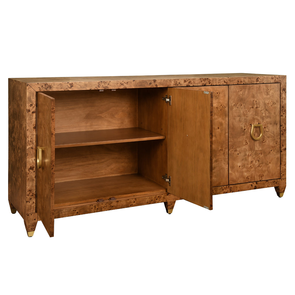 Four door buffet with satin brass horsebit inspired hardware and foot caps in burl wood