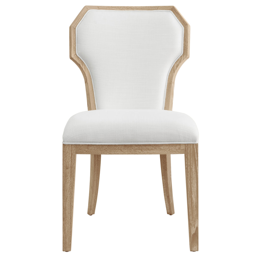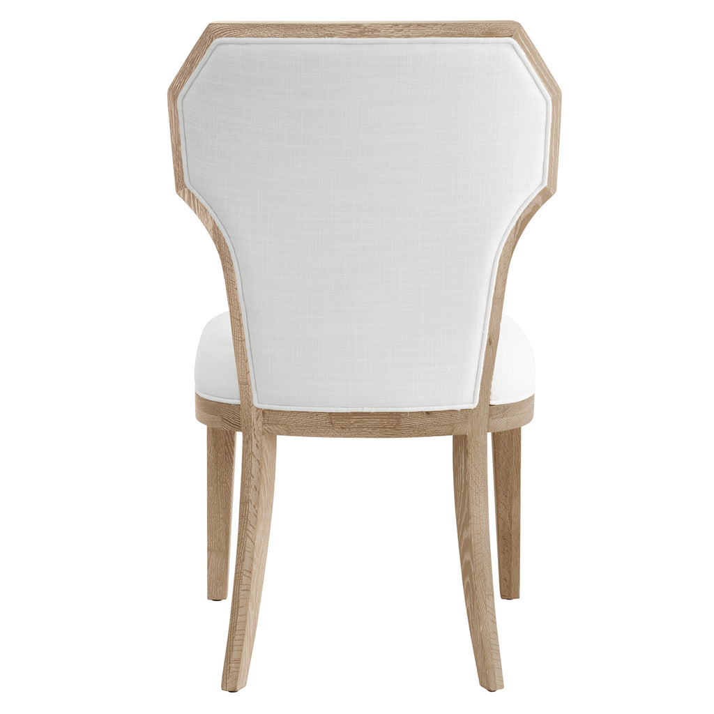 Dining chair with curved angle back in cerused oak with performance white linen upholstery