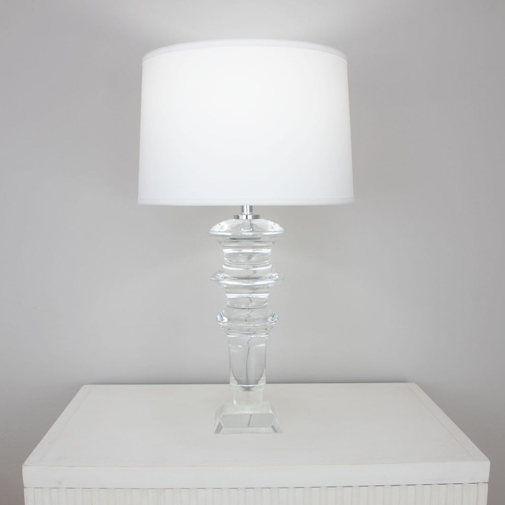 The cleanness of the French Wired design (electrical cord exit near the bulb socket, as opposed to running down the lamp internally and exiting at the base.) lets the beauty of the crystal shine through, unobtrusively. Solid crystal table lamp.