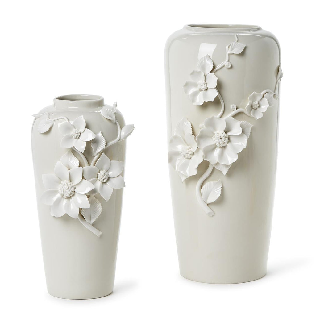 Add a unique touch to your home dècor with the charming set of two vases. Crafted from porcelain, these vases feature 3-D sculpted flowers for a touch of whimsical elegance. The set includes two different shapes and sizes, providing versatility in styling. Place freshly picked blooms or dried botanicals to create a stunning centerpiece on your dining table or add a delicate touch to your mantelpiece display.