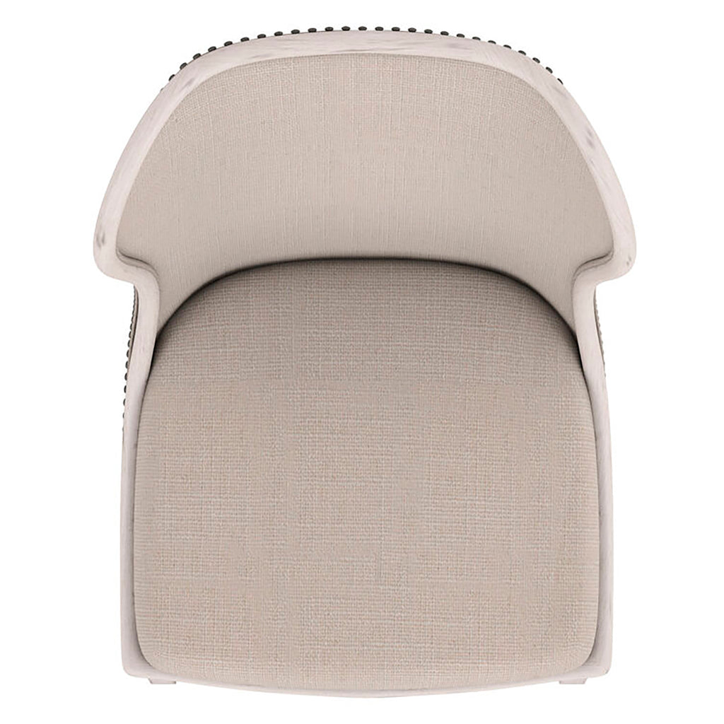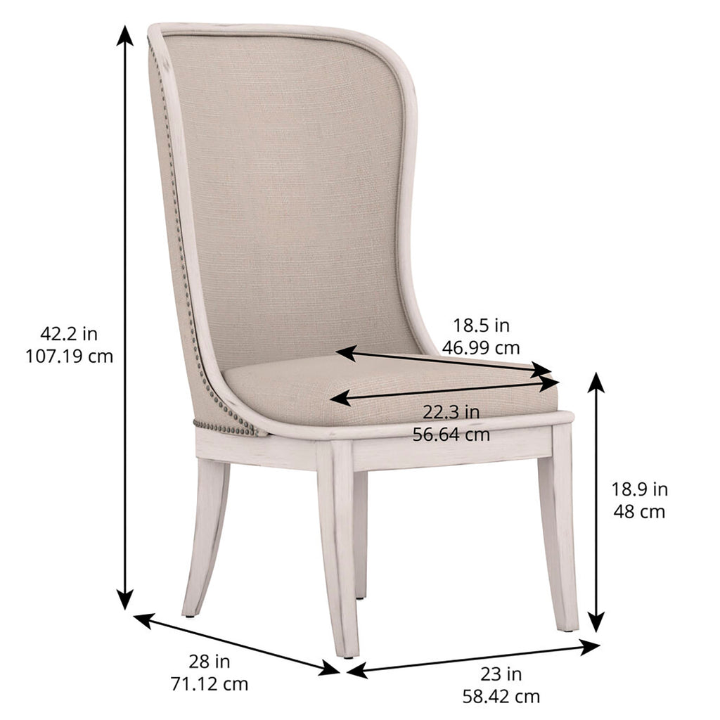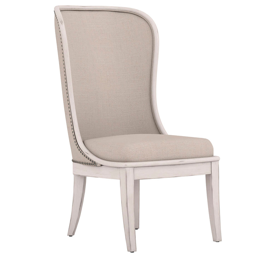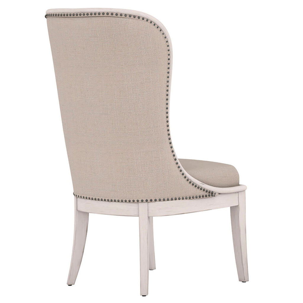 The A.R.T. Furniture Alcove Host Chair offers a combination of elegance, durability, and functionality that will elevate your dining space to new heights. Featuring a sophisticated linen blend upholstery that adds a touch of texture and refinement, its neutral color can adapt to any palette. The combination of durability and softness makes it perfect for everyday use. The outside back of the chair is adorned with burnished brass nailhead trim, adding a tasteful decorative accent that elevates its overall aesthetic and lends an air of classic elegance.