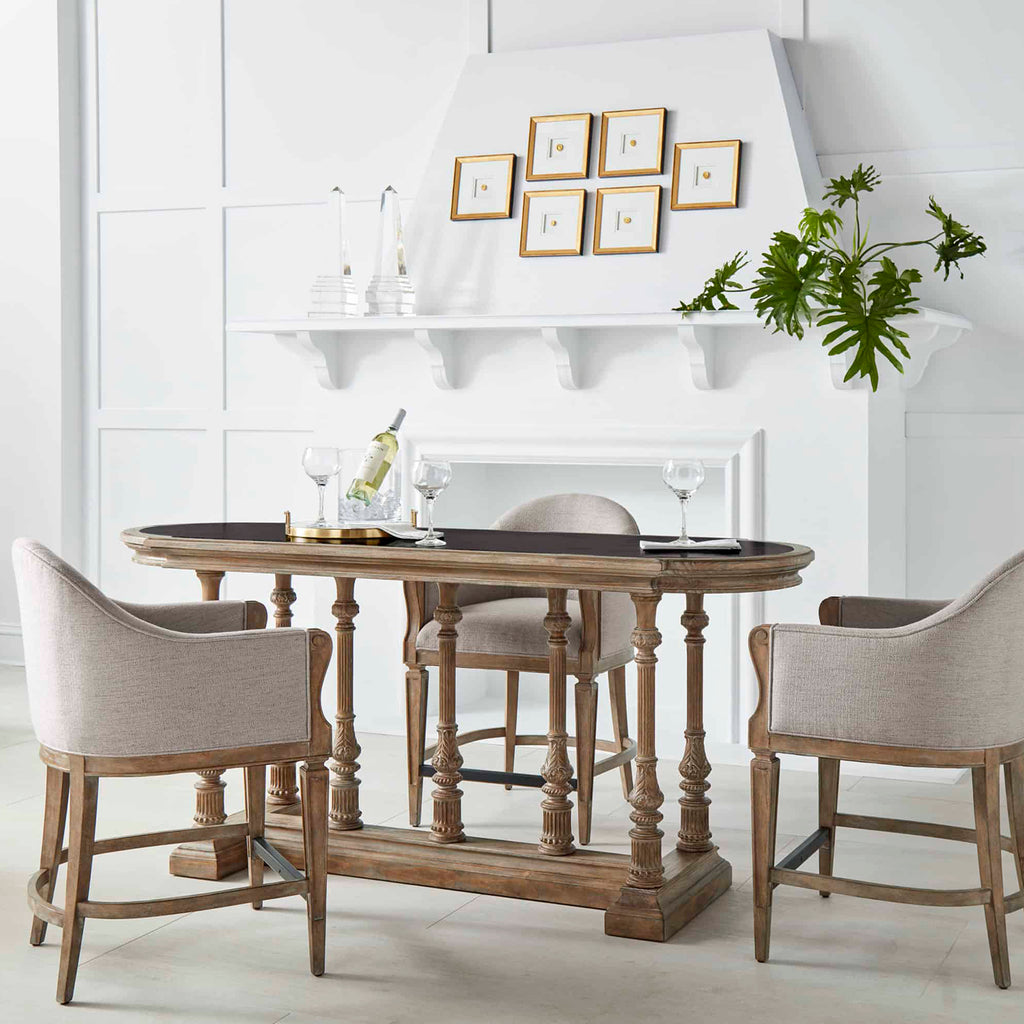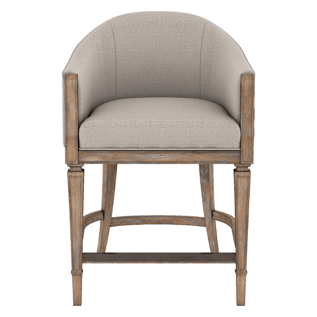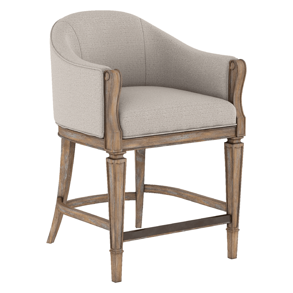 Step across the threshold of a new design frontier with the Architrave collection. Based on an architectural term that refers to a frame surrounding a doorway, this collection symbolizes a transition from history to the future. Architrave is historically inspired, reinventing the strong lines and classic symmetry of Neoclassical style from the Louis XVI period in France. Positioned at counter height on elegantly tapered legs, the Architrave Counter Stool features a upholstered seat and back in neutral woven fabric, and front stretcher bar that doubles as a comfortable footrest. The frame of the counter stool includes subtly scrolled arms, showcasing the beauty of a rustic hand-glazed finish in a warm almond tone that makes this an instant casual classic.