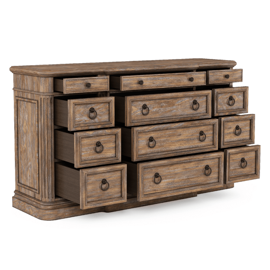 Step across the threshold of a new design frontier with the Architrave collection. Based on an architectural term that refers to a frame surrounding a doorway, this collection symbolizes a transition from history to the future. Architrave is historically inspired, reinventing the strong lines and classic symmetry of Neoclassical style from the Louis XVI period in France. Classical style meets practical storage in the Architrave Dresser, featuring twelve ample drawers with lower drawers lined in aromatic cedar, guaranteed to hold four seasons' worth of wardrobe options. Simple structured panels flanked by fluted details highlight a warm finish and oil rubbed bronze hardware in a balanced style that is equal parts classic and casual.