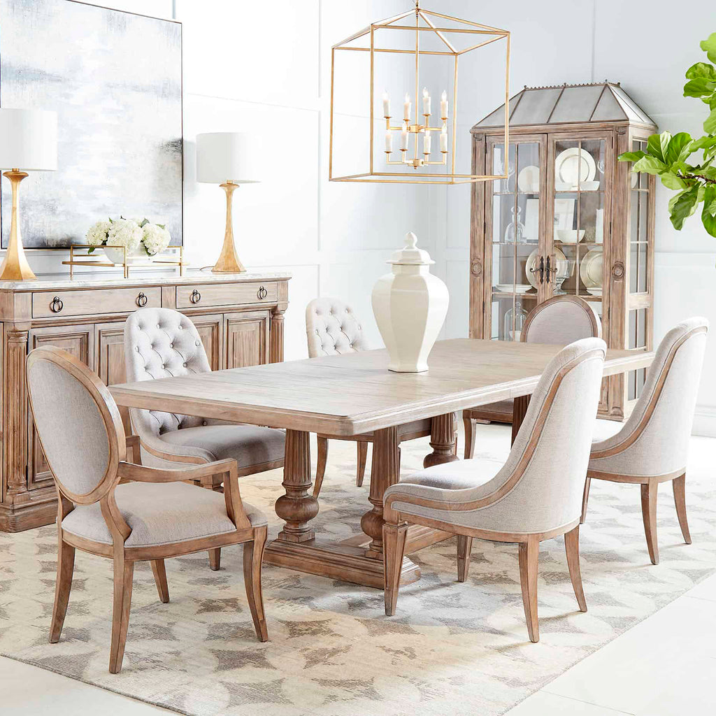Step across the threshold of a new design frontier with the Architrave collection. Based on an architectural term that refers to a frame surrounding a doorway, this collection symbolizes a transition from history to the future. Architrave is historically inspired, reinventing the strong lines and classic symmetry of Neoclassical style from the Louis XVI period in France. The head of the table is traditionally a position of honor, and the eye-catching Architrave Oval Arm Chair adds grandeur and classic beauty to the dining experience. The slightly angled back and luxurious upholstery offer comfortable seating, and can be used to enhance a dining chair set or as an occasional chair in a bedroom or living space.