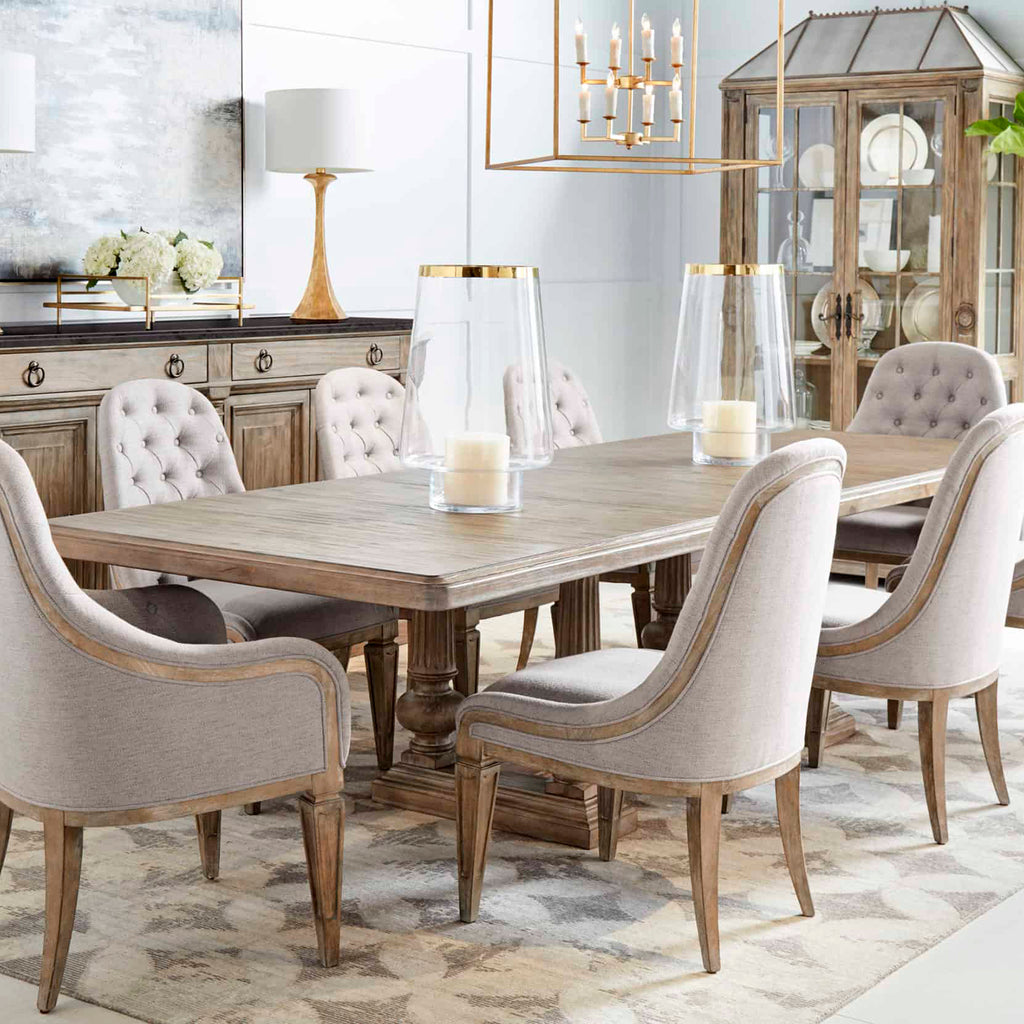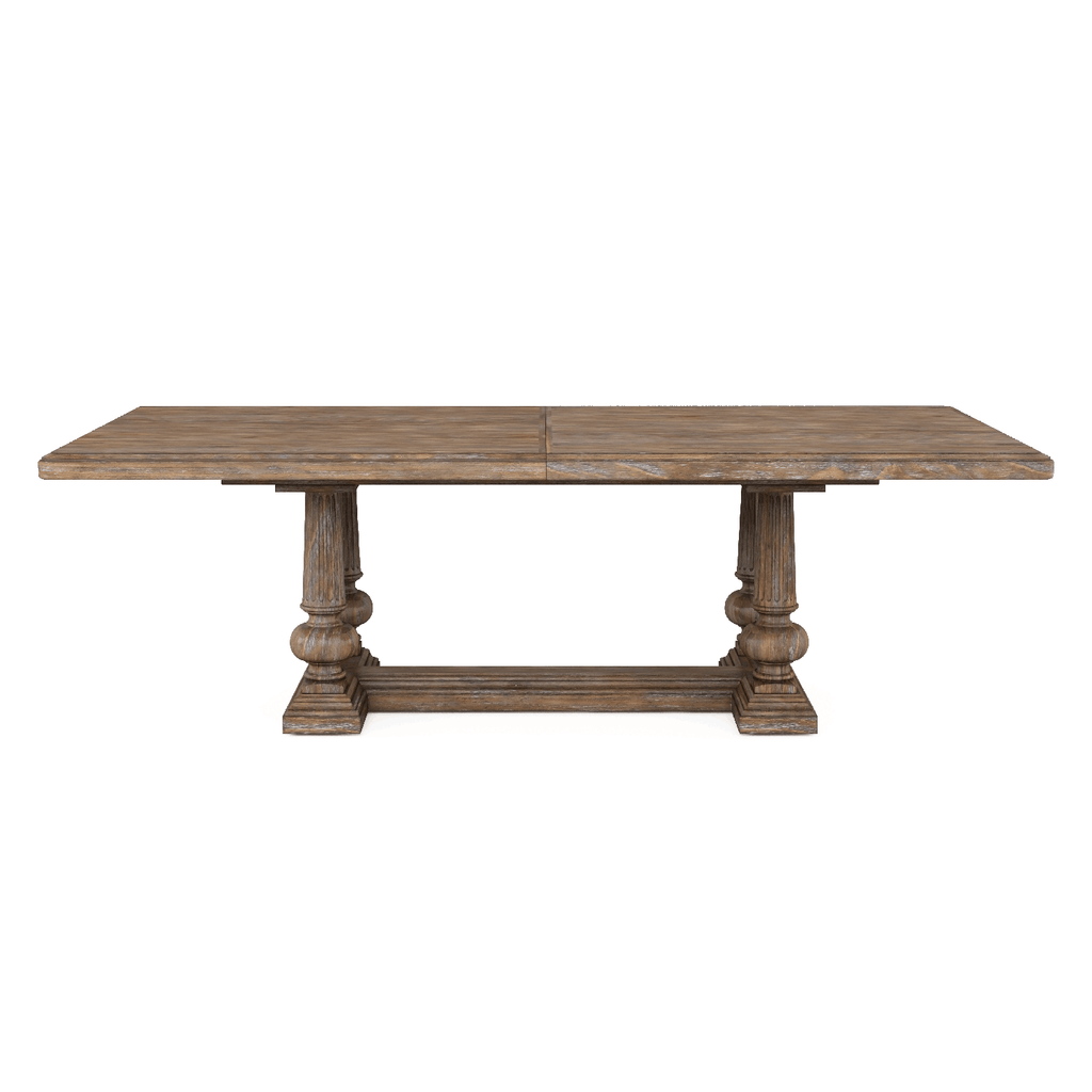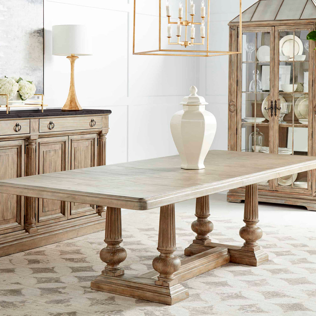 Step across the threshold of a new design frontier with the Architrave collection. Based on an architectural term that refers to a frame surrounding a doorway, this collection symbolizes a transition from history to the future. Architrave is historically inspired, reinventing the strong lines and classic symmetry of Neoclassical style from the Louis XVI period in France. Sturdy enough to stand up to the challenge of daily family dinners, yet stylish enough to turn heads, the Architrave Trestle Table beautifully combines both form and function. The four support columns are beautifully embellished in a fluted style, the hallmark of the Architrave collection, while the solid trestle base evokes the feeling of grand historical architecture. The 96-in table can be extended to 116-in or 136-in with the addition of one or both leaves.