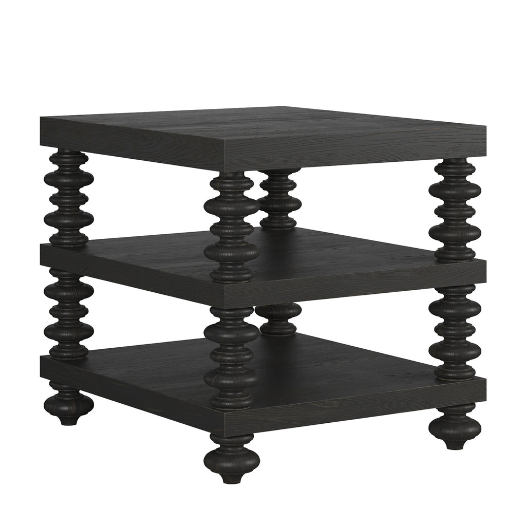 Gracefully turned wood columns support the top of the Atrium End Table, as well as two open shelves for storage or display. The finish on the heavily grained wood construction is a rich hand-glazed sable tone, which adds casual traditional-meets-modern flair to any living space.