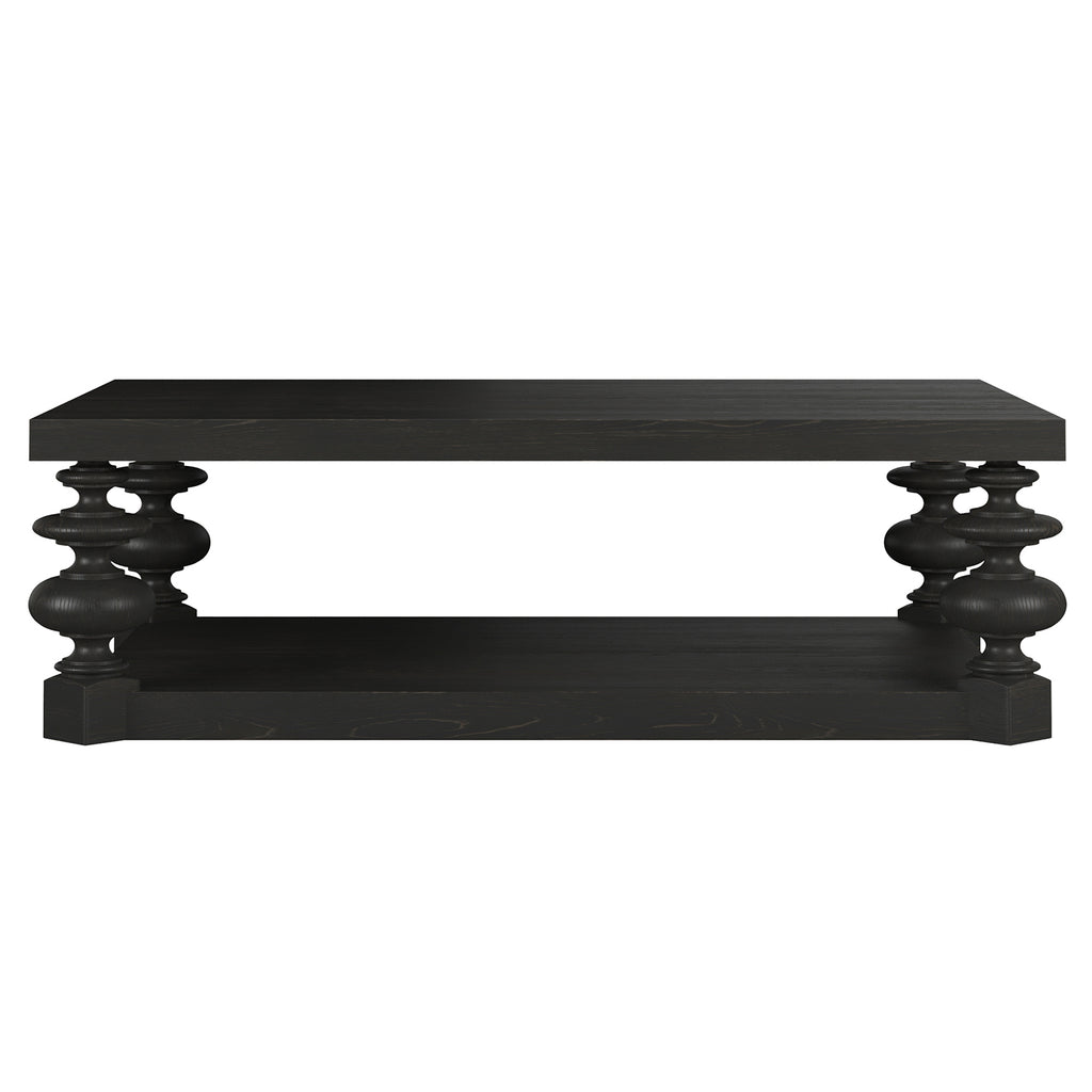 The Atrium Rectangular Cocktail Table provides a striking centerpiece to any living area, as well as plenty of surface area for both relaxing and entertaining. Four dramatic columns support the table, representing an exaggerated version of 18th-century neoclassical columns, bringing historical style into the 21st century with contemporary boldness. Heavily grained wood is hand-glazed in a rich blackened sable finish, allowing the beautiful wood grain a chance to peek thru and representing a balance of Old World formality with comfortable modern charm.