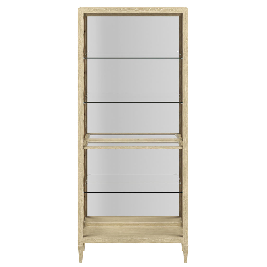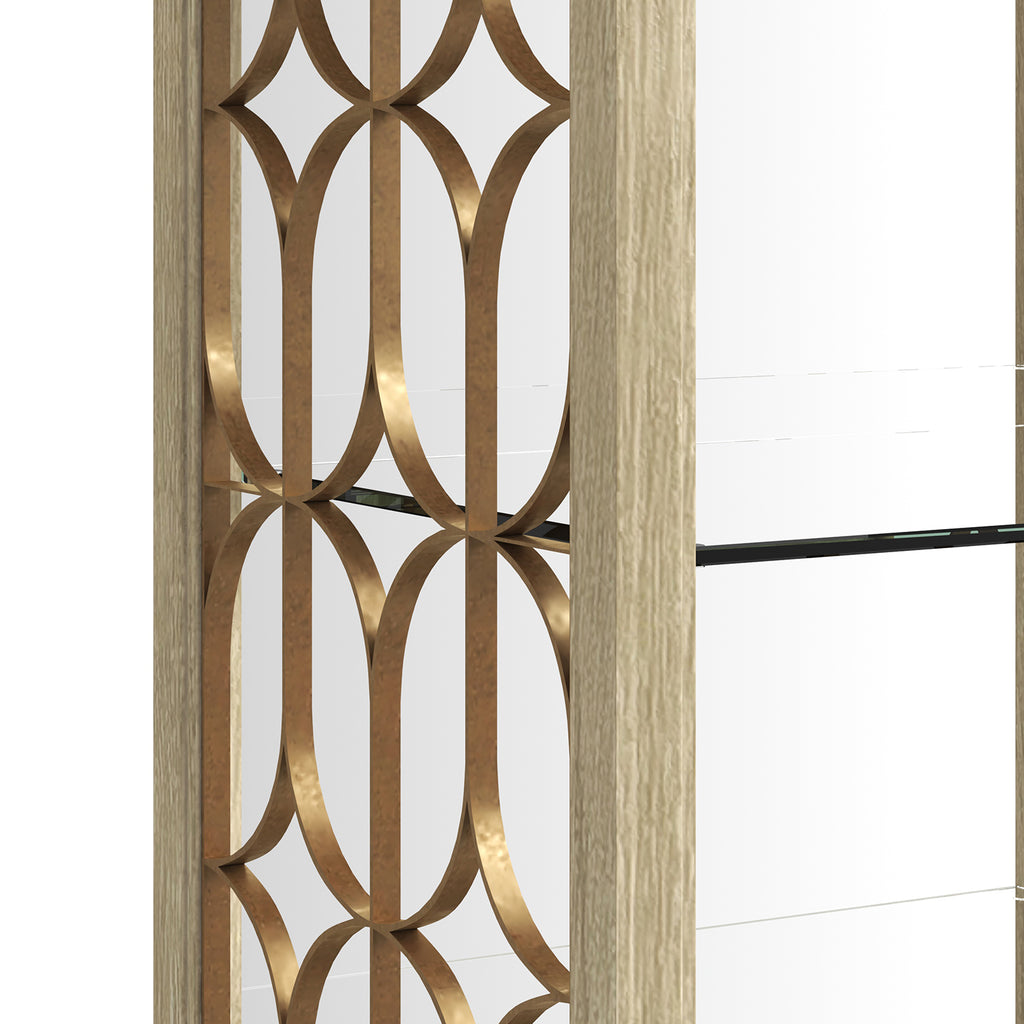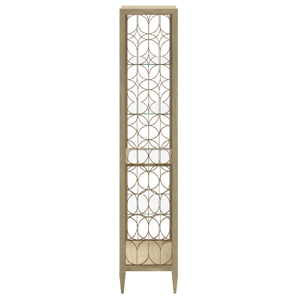 Introduce a touch of architectural elegance and contemporary design to your living space with the Eave II Etagere. This piece, from the esteemed Eave II collection, combines clean lines with intricate details in a fresh, contemporary palette. The etagere features a slender, rectangular frame finished in a crisp, clean white that brightens any interior. The open design showcases a series of glass shelves, providing ample space for displaying decorative items, books, or plants. The frame is further enhanced by its unique, geometric fretwork panels, crafted from a warm metallic material that adds a touch of glamour and visual interest. The etagere rests on slender, tapered legs, adding a touch of lightness and sophistication. The Eave II Etagere is designed to be a statement piece, blending unique design with practical display functionality. Its refined design allows it to seamlessly integrate into a variety of interior styles, adding a touch of artistic flair and contemporary elegance.