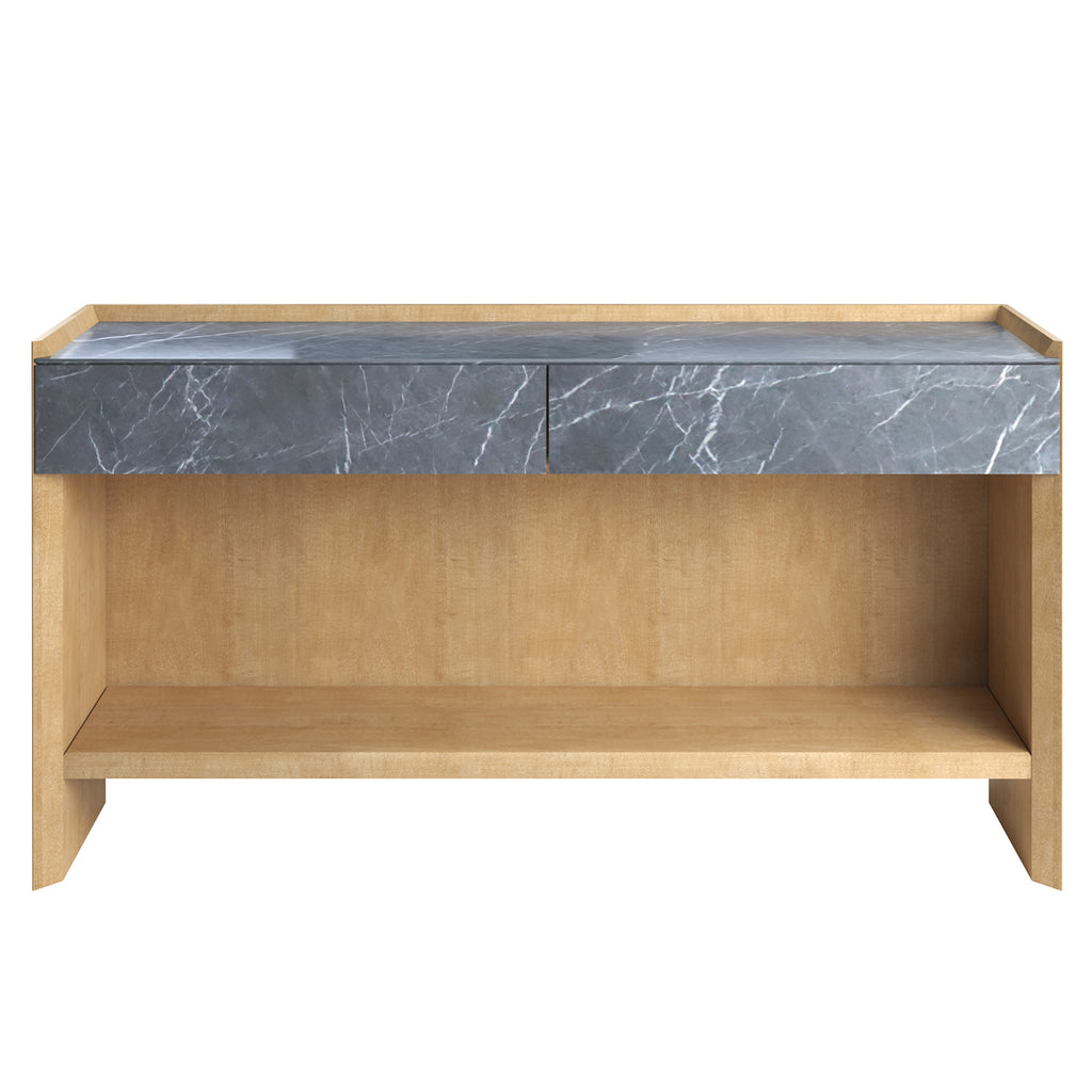 Classic Contemporary Console Table in Figured Maple with Honed Marble faced Drawers and Top as well as fixed shelf below