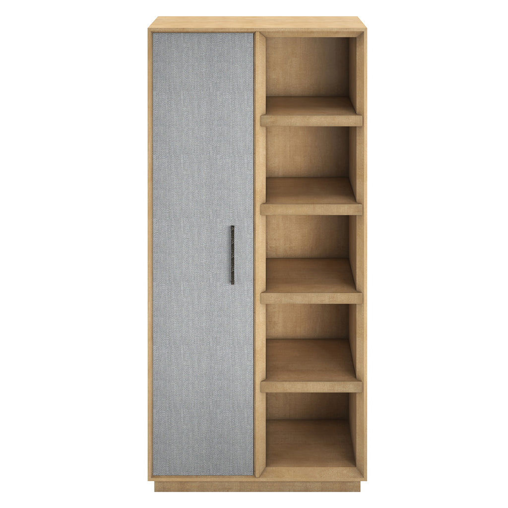 Classic Contemporary Etagere Bookcase in Figured Maple with Textured Fabric Door on the left and Shelves on the left.