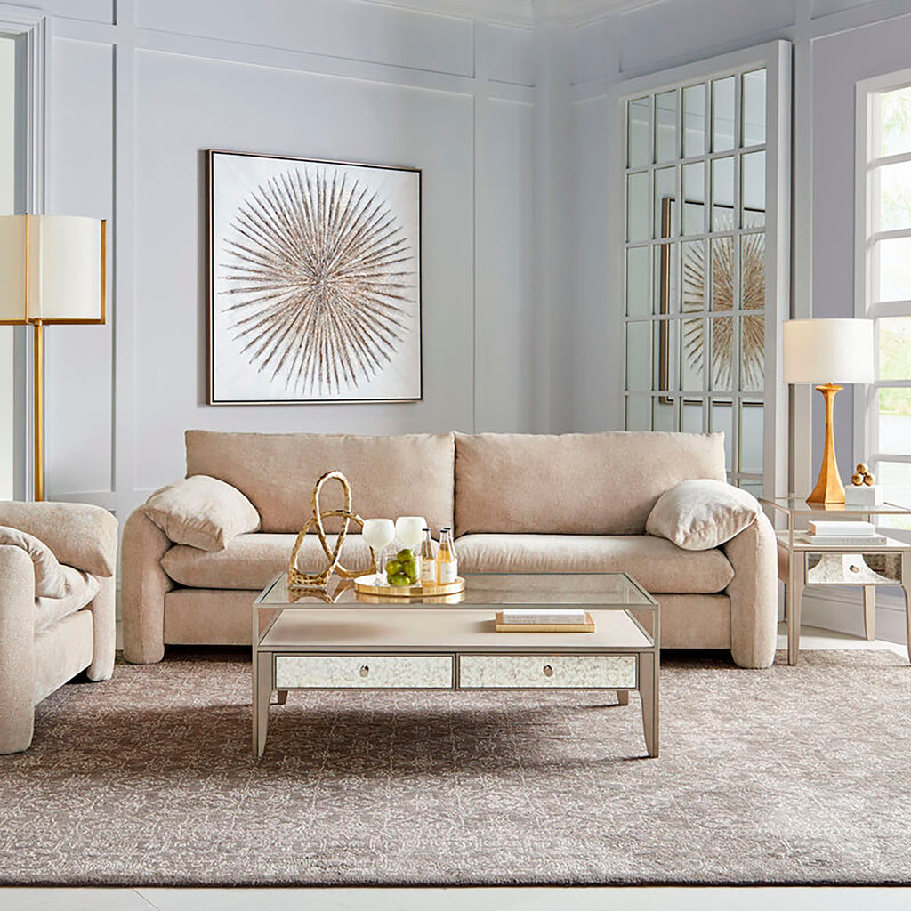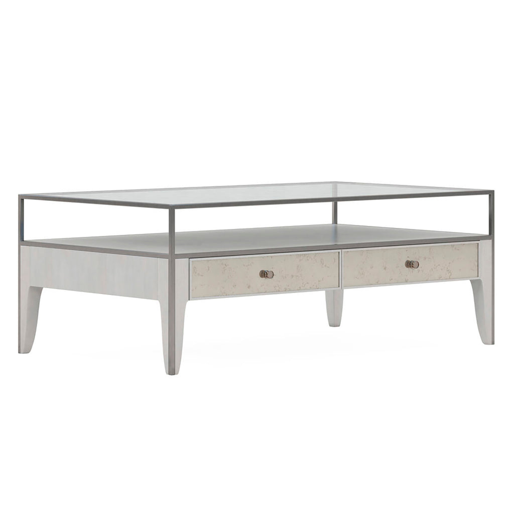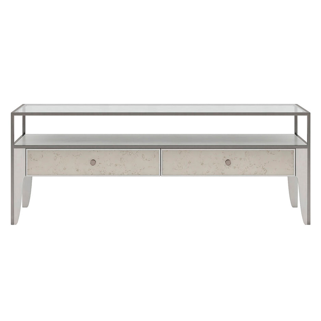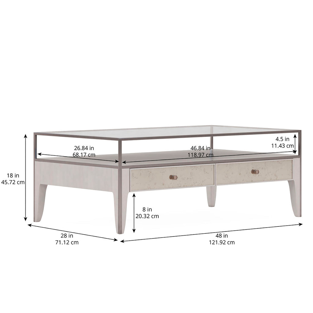Go ahead and raise your glass, we have the perfect spot to set it down! This stylish rectangular table combines natural beauty of maple veneer finished in dove gray with a sleek metal frame and antiqued mirrored details, perfect for all forms of transitional decor. A pair of drawers finished in mirror and nickel hardware offer the perfect place to stash away all your living room?s necessities in style.