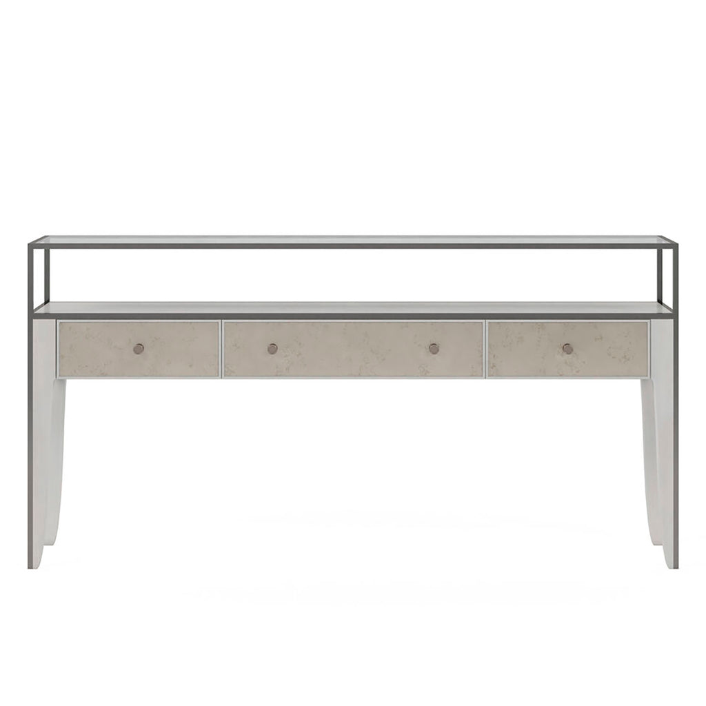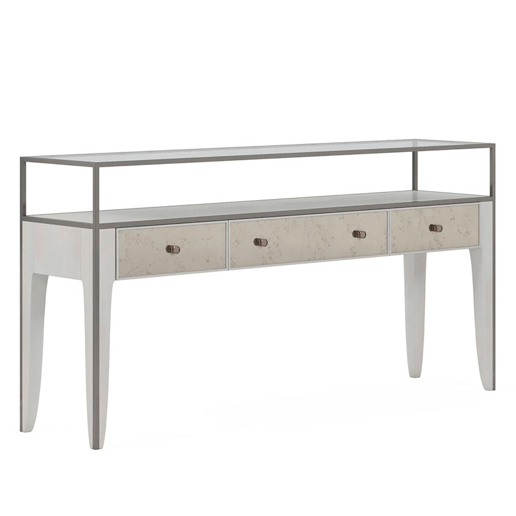 Chic and slim as a couture ensemble, this attractive console combines the antique-inspired warmth of Paris with the fashionable appeal of transitional style. Versatile enough to suit the entryway, hallway or living room, the raised glass top offers the perfect spot to display lamps and frames, while three drawers finished in antiqued mirror provide plenty of concealed storage.