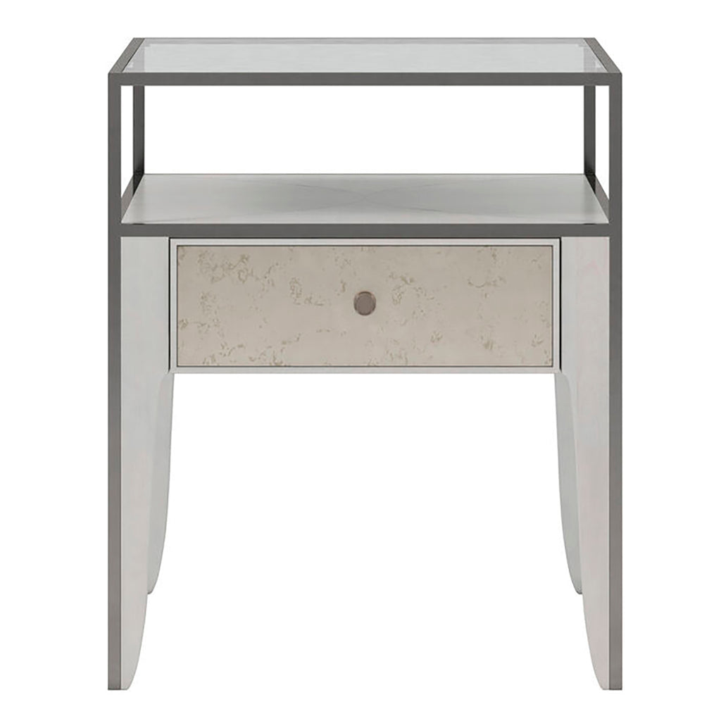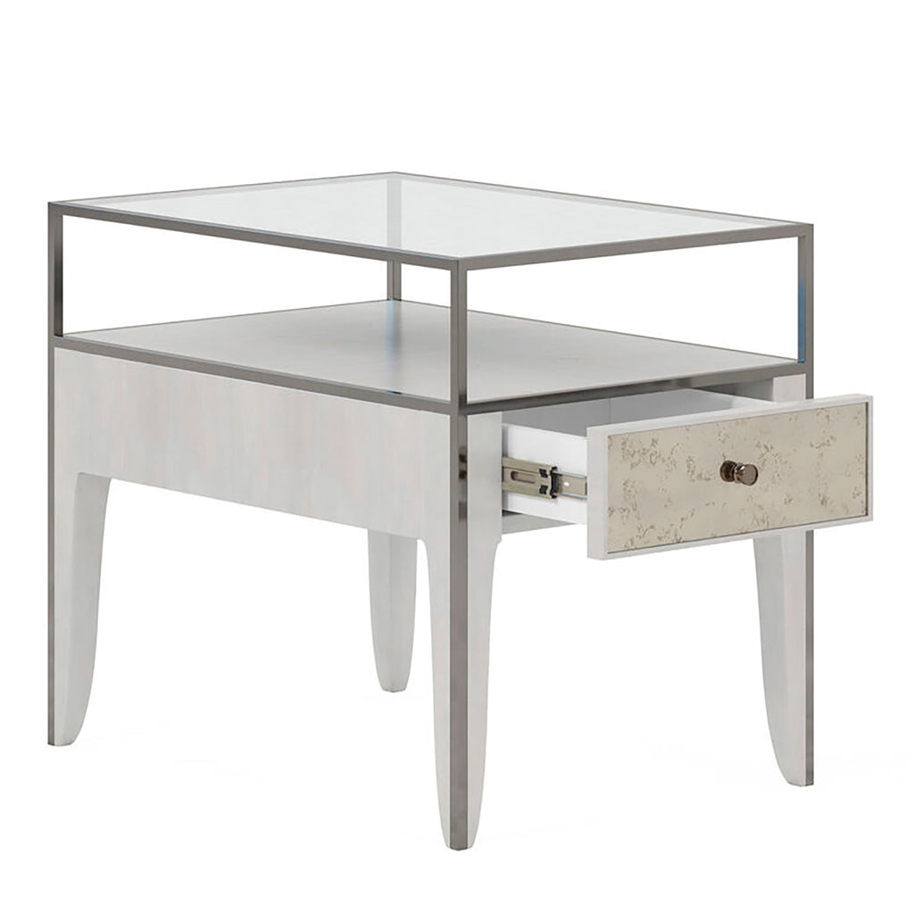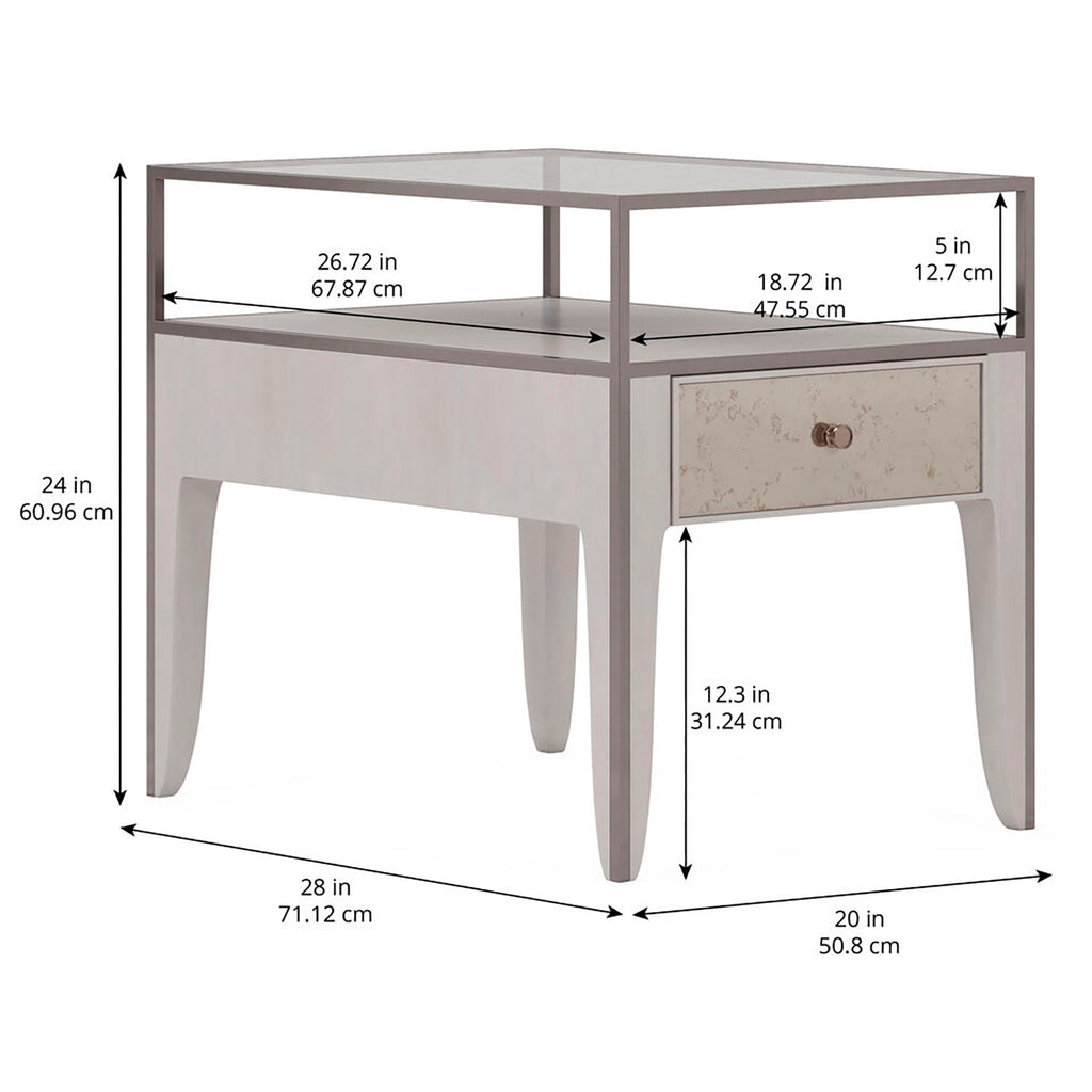 Simplicity is always in fashion. This versatile end table with a raised glass top is a lovely addition to any room that needs a compact piece offering both storage and style. The natural beauty of maple veneer finished in dove gray contrasts with a sleek metal frame and mirrored drawer front, creating a transitional look that blends vintage warmth with cool modernity. A central drawer allows just enough space for all your living room's necessities.