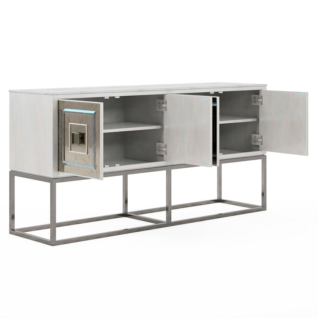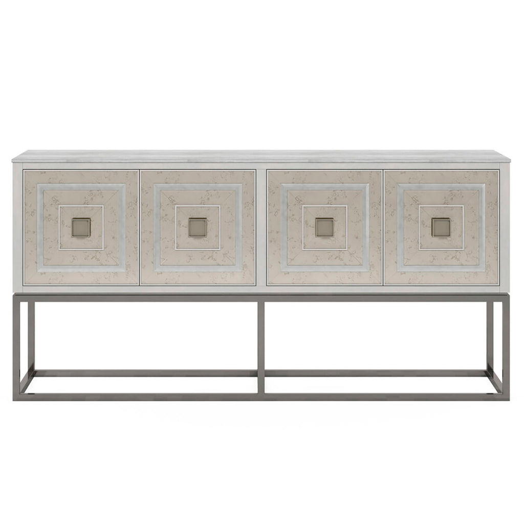 This attractive console meets all your 21st century technology needs in a vintage-inspired style that suggests the iconic glamour of Paris. This unique console features mixed materials including a luxurious stone top, maple veneer finished in dove gray, antiqued mirror accents and an open metal frame. Four doors reveal two adjustable shelves and plenty of storage for media, accessories, and all your other entertainment essentials.