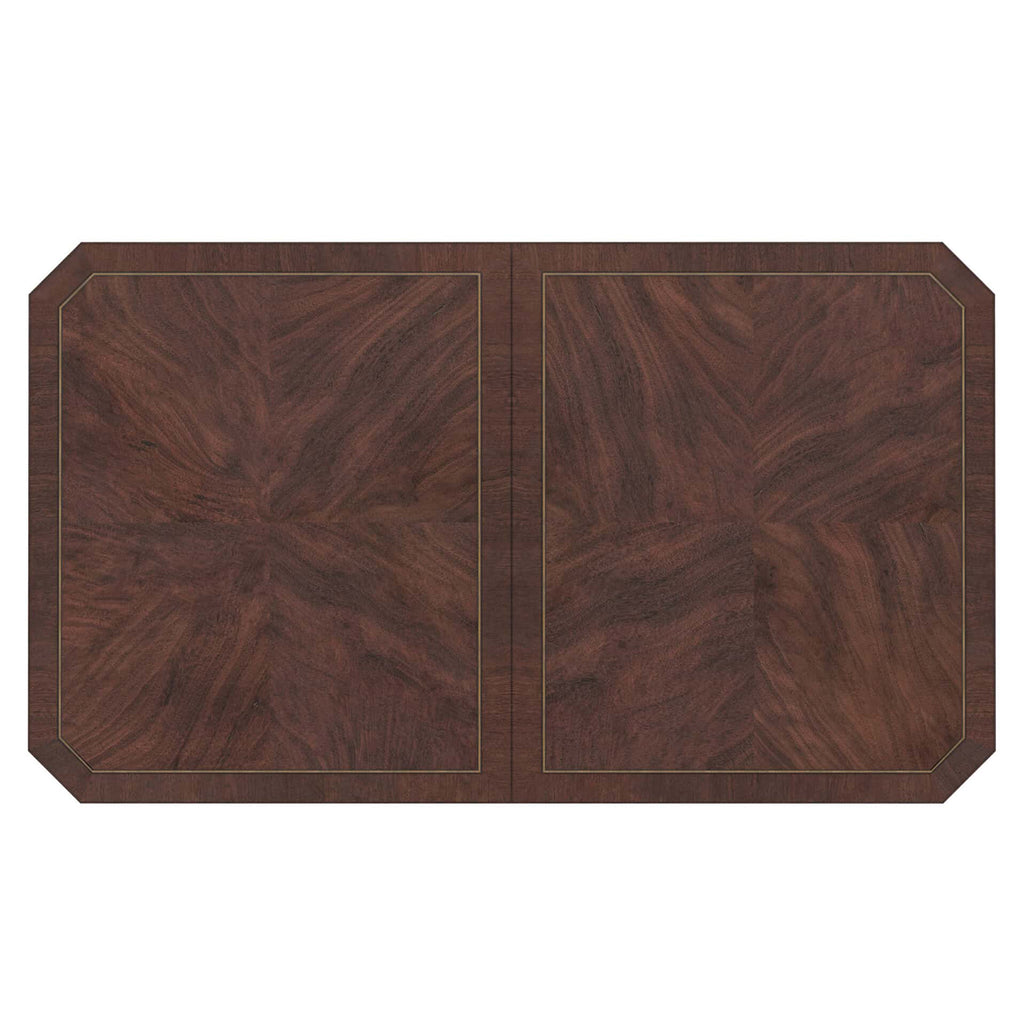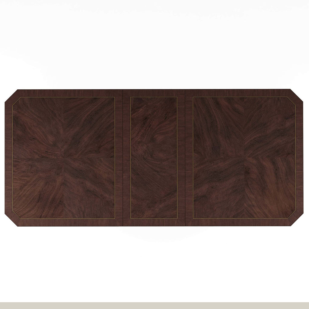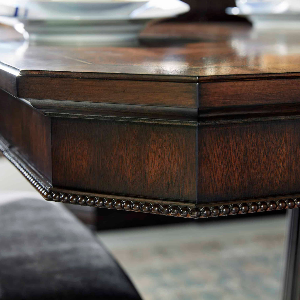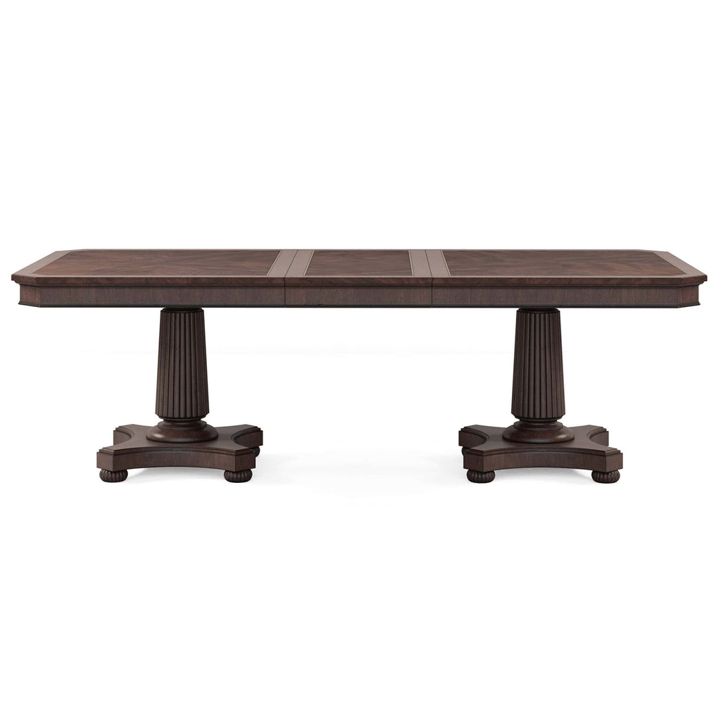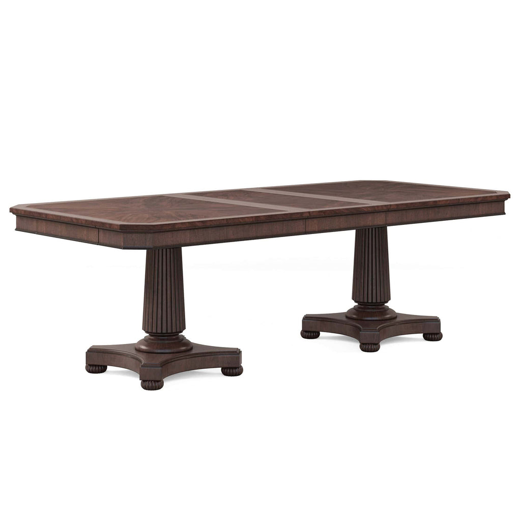 With its exquisite design, premium craftsmanship, and versatile functionality, our Revival Dining Table sets the stage for unforgettable dining experiences, creating cherished memories with family and friends for years to come. The tabletop features stunning swirl mahogany veneers, highlighted by contrasting satin wood inlay and canted corners surrounded by an apron adorned with beaded trim. It sits atop a dual pedestal base, featuring two fluted columns on bun feet. Two drawers on either end of the tabletop feature felt-lined bottoms, providing convenient storage for dining essentials such as table linens, silverware, or serving utensils. With the inclusion of two 20-inch leaves, this dining table can easily extend to accommodate up to fourteen chairs.