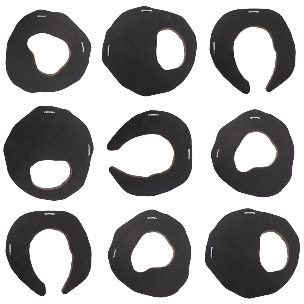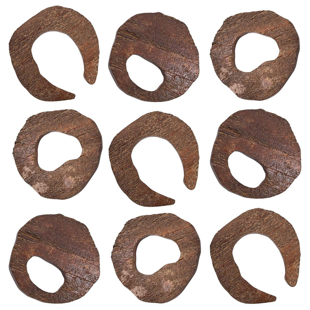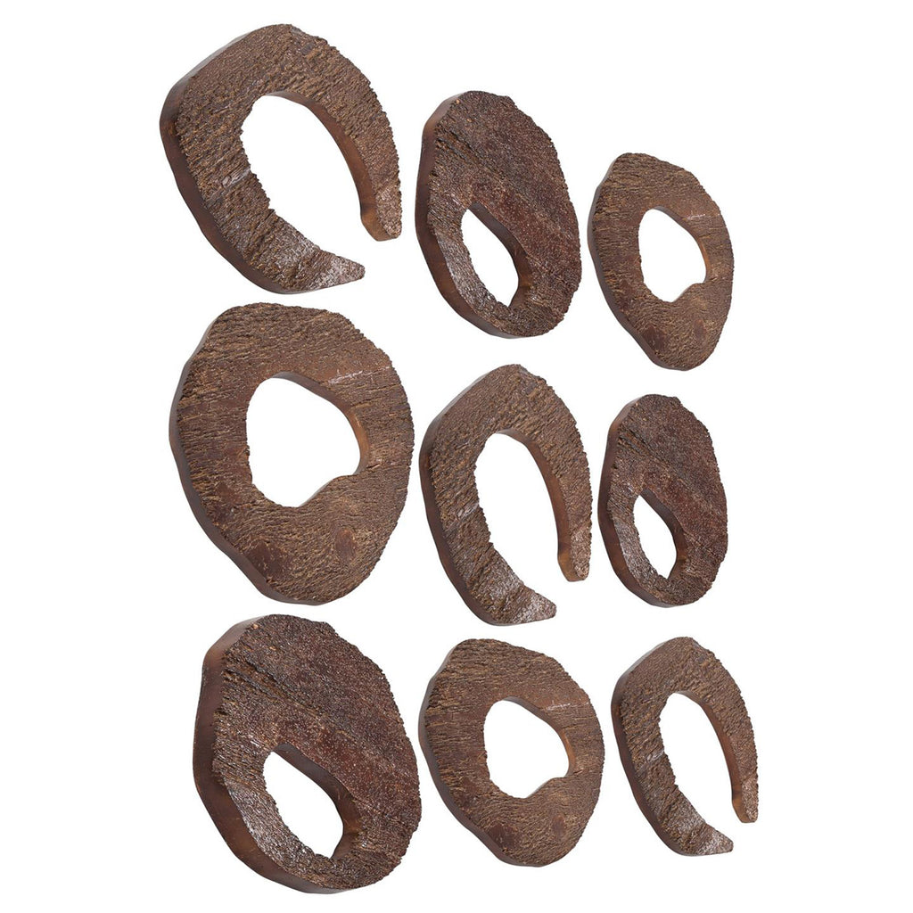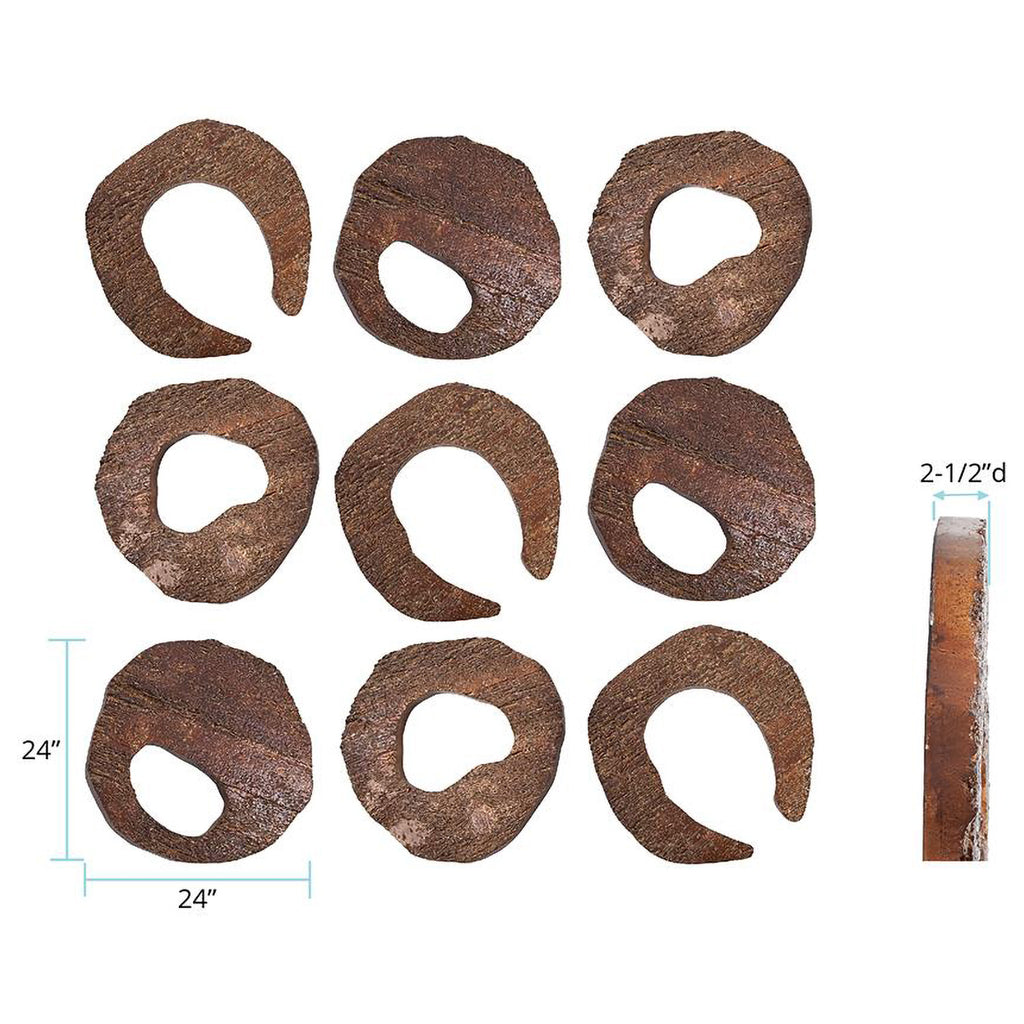 Thick wooden slices of tree truck, with it's natural growth and textures, gives this set of 9 an unbelievably simple but stunning look. Nature once again becomes our best muse and helps us create art that speaks to the most classic of styles to the modern minimalist. The back hardware of each piece give us two directional options for hanging so that that the pattern can be created in a few ways to suite your own space or home decor.