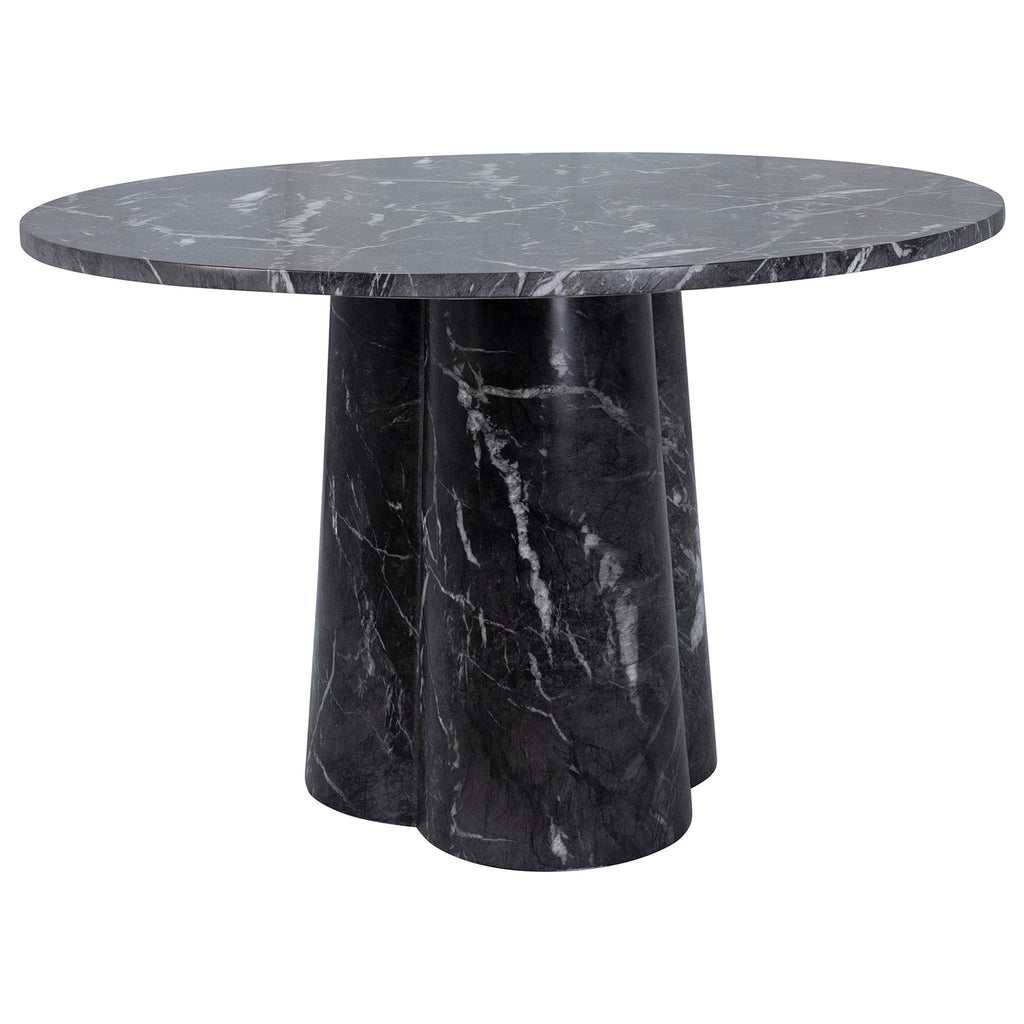 Black marble brushed with white veins creates this alluring dining table. Featuring a round shape on a sturdy pedestal base that is not only contemporary but extremely enticing. Sophisticated charm exudes from the Selina dining table, making it perfect for serving everyday meals or hosting special occasions.