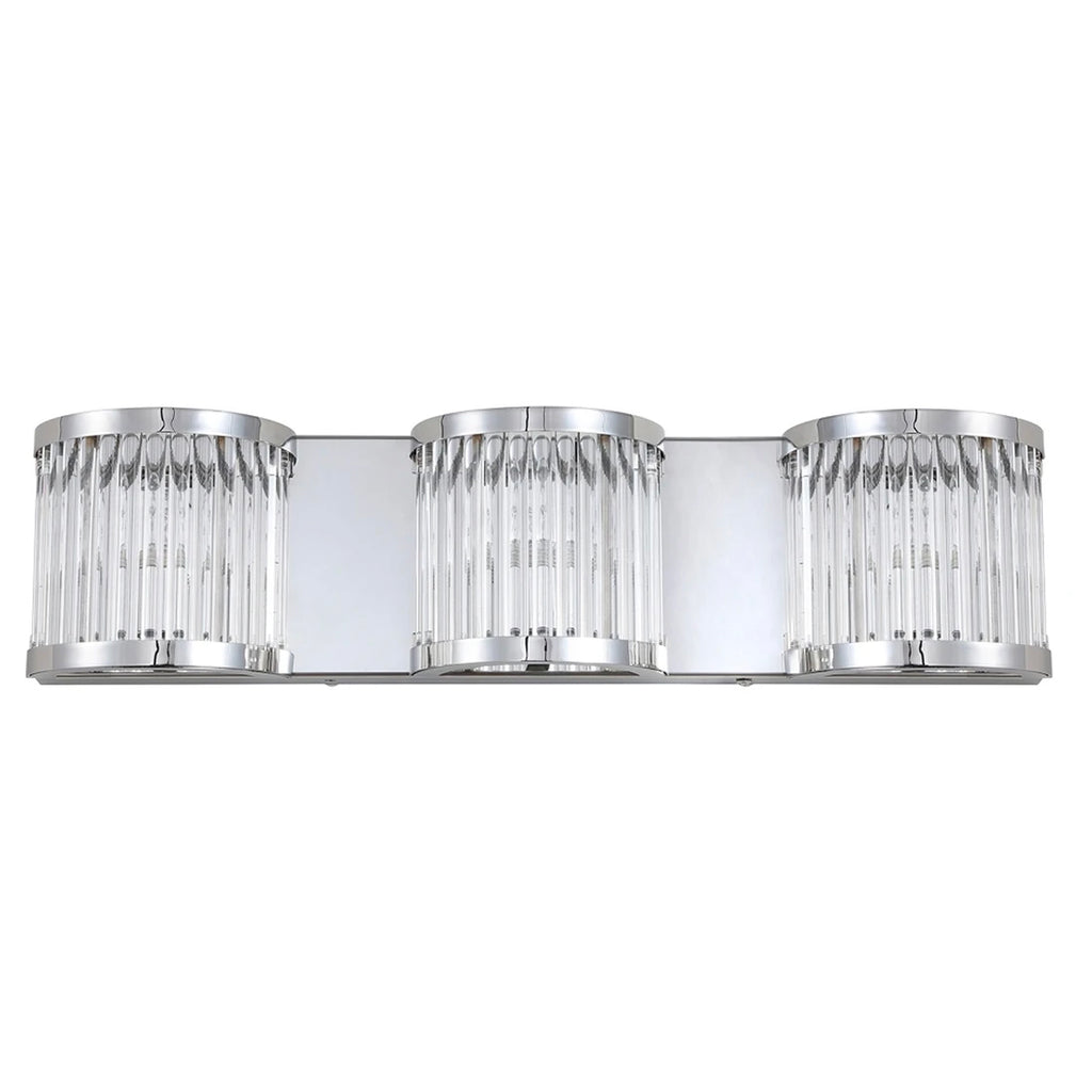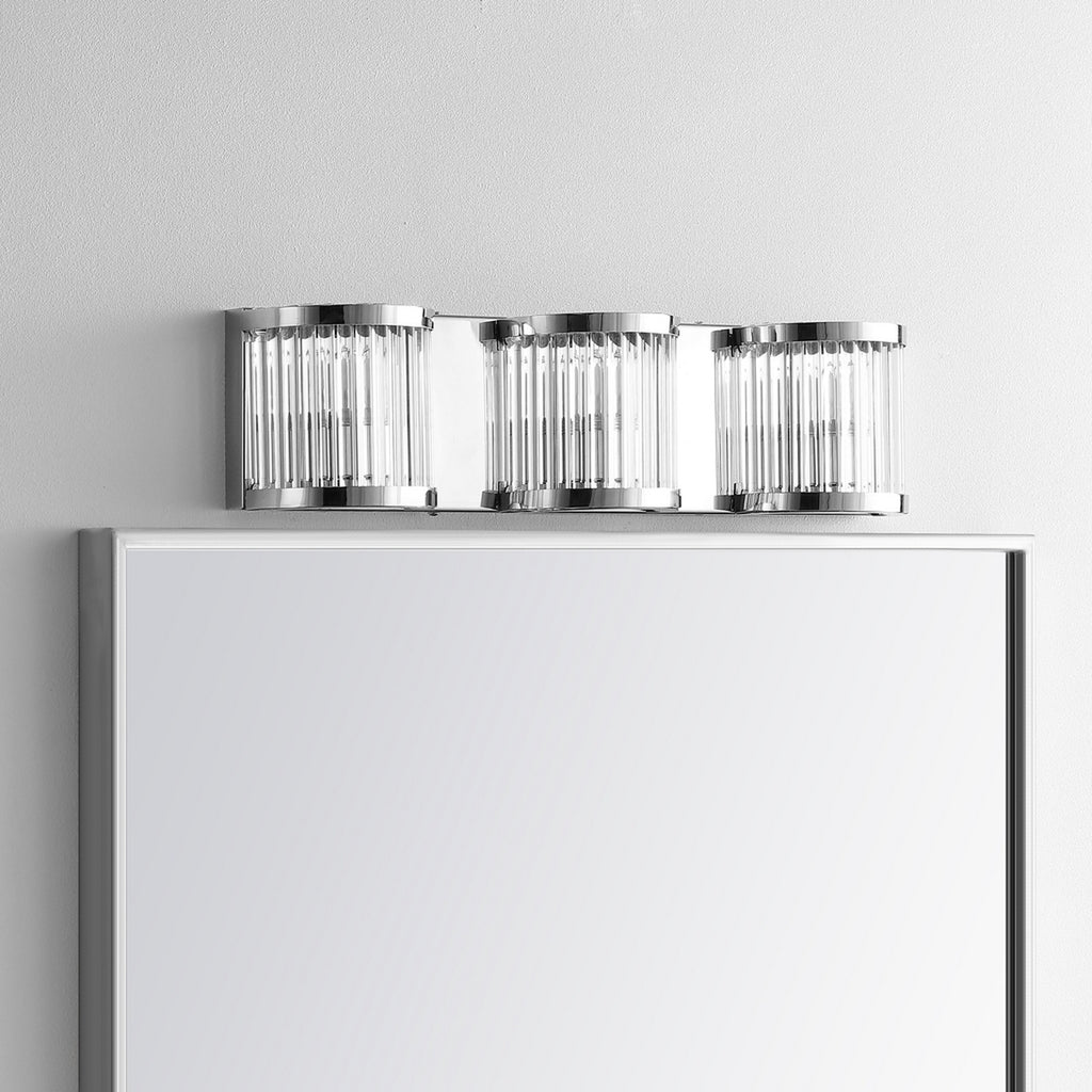 A posh example of the rule of threes in contemporary lighting, this 3-light wall sconce boasts the penthouse-chic style of celebrity interior design. Art Deco style beams through a flowing glass shade and a polished Chrome finish, breathing an air of opulence into any contemporary living space.