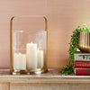 With a rare oval shaped glass hurricane, this unique candleholder is a work of art. The simple design and warm matte brass details only add to it's appeal.