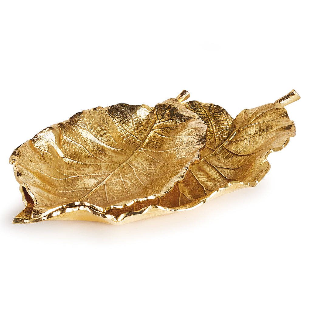 A hand-carved clay mold is what creates the natural leaf details. Made of aluminum, these substantial trays are then finished with a golden hue. On coffee table, console or countertop, they'll steal the show.