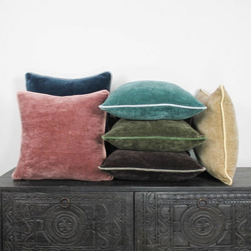 The rich hues of this velvet pillow is as luxurious as the fabric itself. A contrasting piping on the edges provides an interesting and appealing accent. Includes polyester fiber pillow insert.