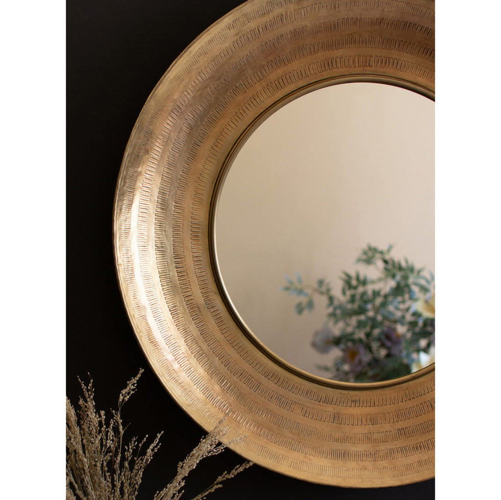 This round mirror with a copper frame, made in India, suits modern and traditional decor styles. It stands out against dark colors or adds depth to neutral walls. Enjoy it in a powder room or above a vanity for extra luxury.